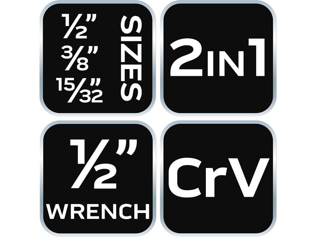 Skrutkovací bit 2 v 1, oceľ CRV, pre 1/2" vnútorné a vonkajšie kľúče, veľkosti 1/2", 3/8", 15/32", adaptér pre vnútorné kľúče