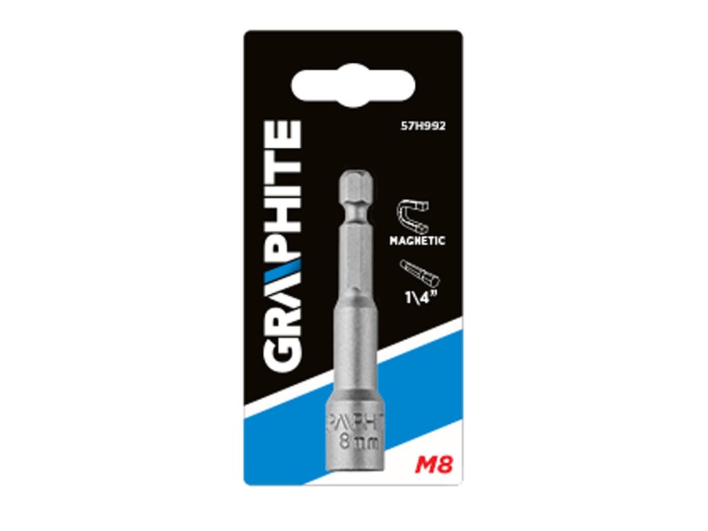 Magnetická objímka GRAPHITE (bez ref. Č. 57H992), s veľkosťou 8 mm, je určená pre samovrtné skrutky so šesťhrannou hlavou veľkosti 8 mm, vyrobená z vysoko odolnej chrómovej ocele 50BV30. Silný magnet uložený v bronzovom puzdre chráni skrutky pred vypadnutím z objímky počas počiatočnej fázy skrutkovania.