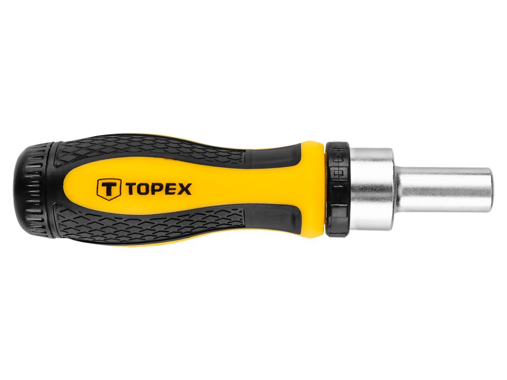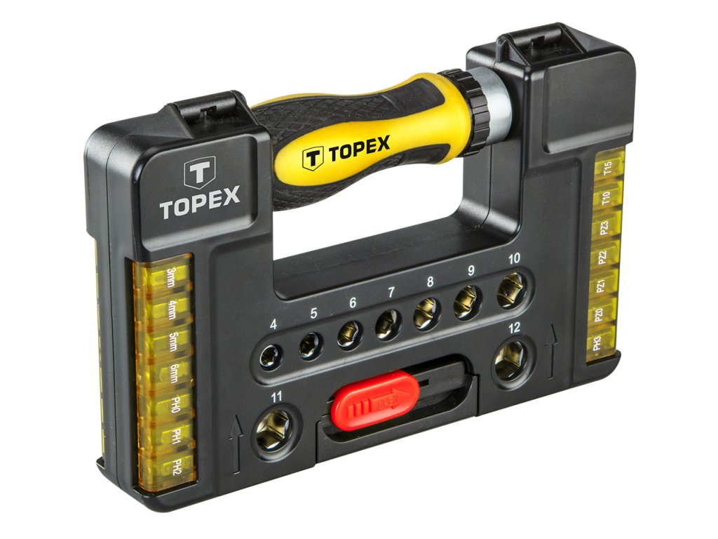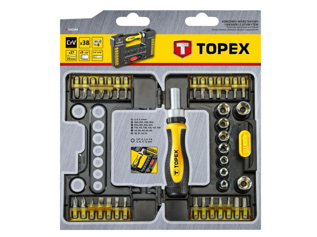 Bity so skľučovadlom a násadky TOPEX (ref.č. 39D344) usporiadané v pohodlnej a odolnej taške z plastu. Všetky prvky sú z vysoko-kvalitnej chrómovo-vanádovej ocele zaručujúcej dlhú životnosť. V sade sa nachádza okrem iného sada šesťhranných bitov a populárnych vŕtacích koncoviek, príslušenstvo (okrem iného kĺb, predlžovače a sľučovadlo). Sada má všestranné použitie pri drobných montážnych prácach, opravách strojov a iných prácach doma a v garáži každého domáceho majstra. Sada je určená pre domácich majstrov.