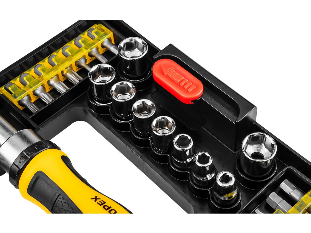 Bity a násadky so skľučovadlom (ref.č. 39D344, 1/4", magnetické bitové skľučovadlo s račňou, 1 adaptér, 9 ks násadiek, rozmery 4, 5, 6, 7, 8, 9, 10, 11 mm, 27 ks bitov, rozmery ploché 3, 4, 5, 6, mm, krížové PH0, PH1, PH2, PH3, PZ0, PZ1, PZ2, PZ3, Torx: T10, T15, T20, T25, T27, T30, Hex H2, H3, H4, H5, H6, S0, S1, S2, S3 oceľ CrV, plastové balenie