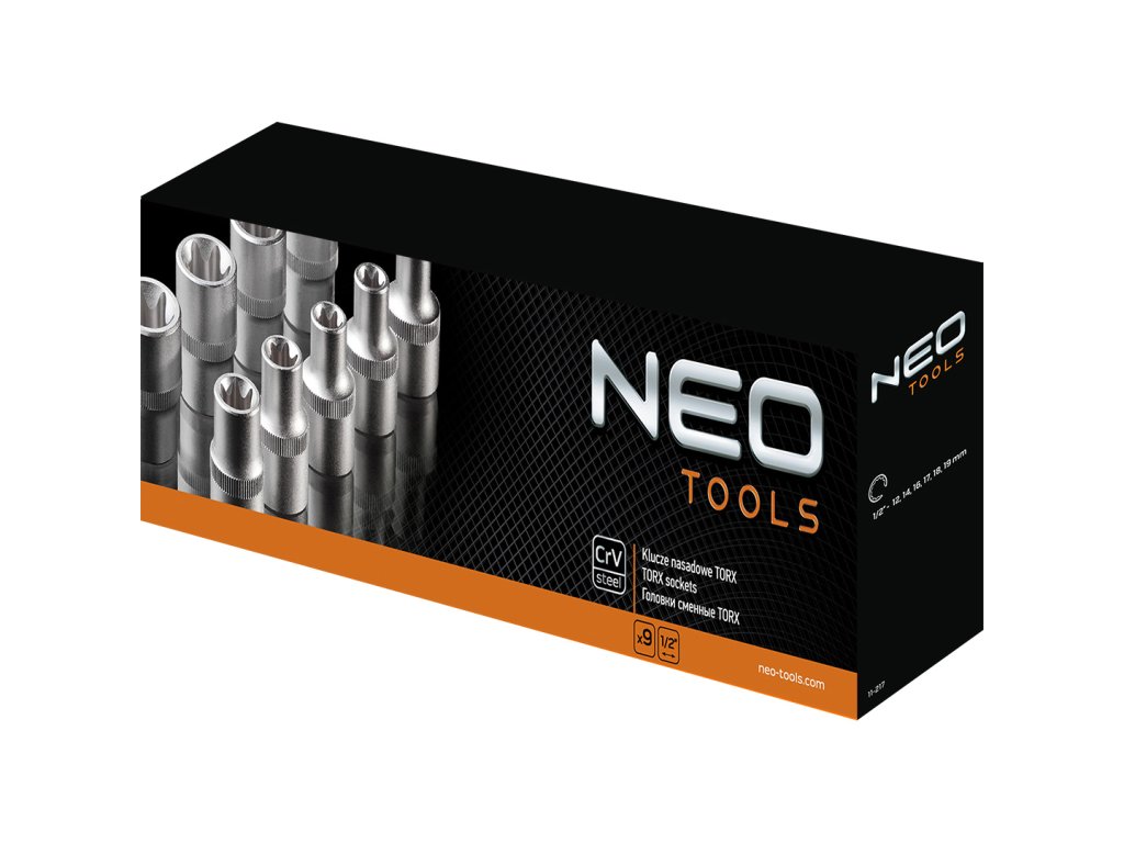 Nástrčné kľúče NEO 1/2" Torx (ref. 08-649). Sada obsahuje 9 kusov vysokokvalitných nástrčných hlavíc Torx vo veľkostiach od E10 do E24. Zásuvky sú vyrobené z odolnej chróm-vanádiovej ocele, ktorá zaručuje dlhodobú životnosť. Celok sa dodáva v robustnej kovovej škatuli. Kvalitu náradia potvrdzuje certifikát TÜV a 25-ročná záruka výrobcu. Značka NEO spĺňa očakávania profesionálov.