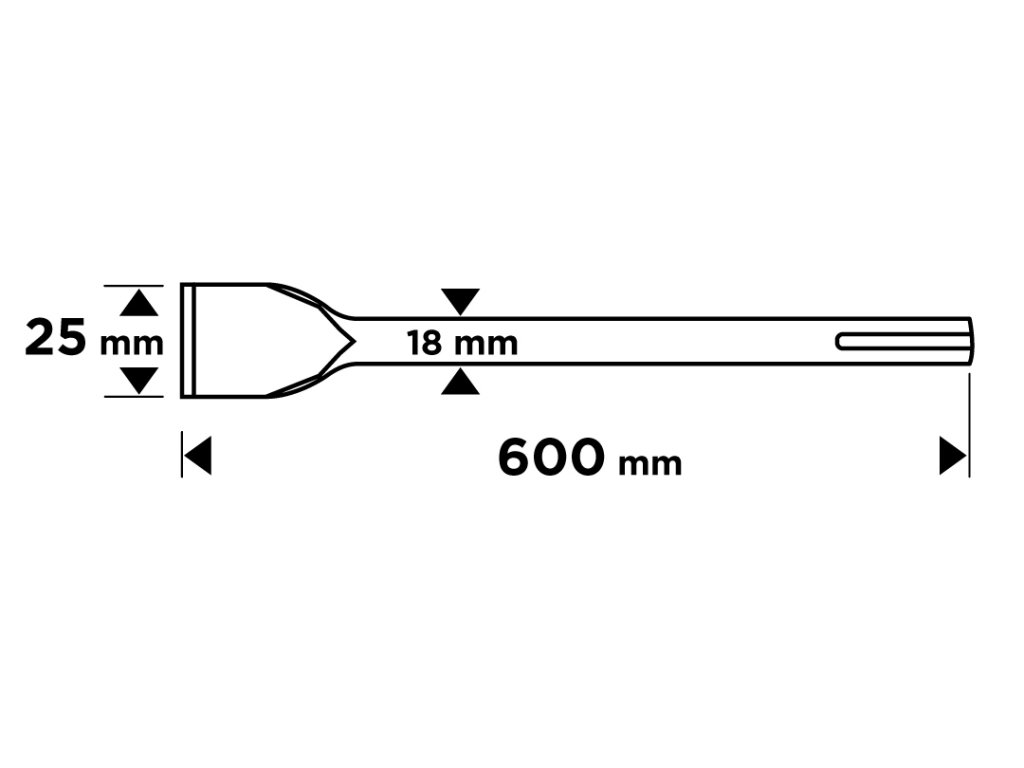 Plochý sekáč, držiak SDS Max. Priemer 18 mm, celková dĺžka 600 mm, šírka pracovnej časti 25 mm, dĺžka pracovnej časti 25 mm, použitie: na betón.