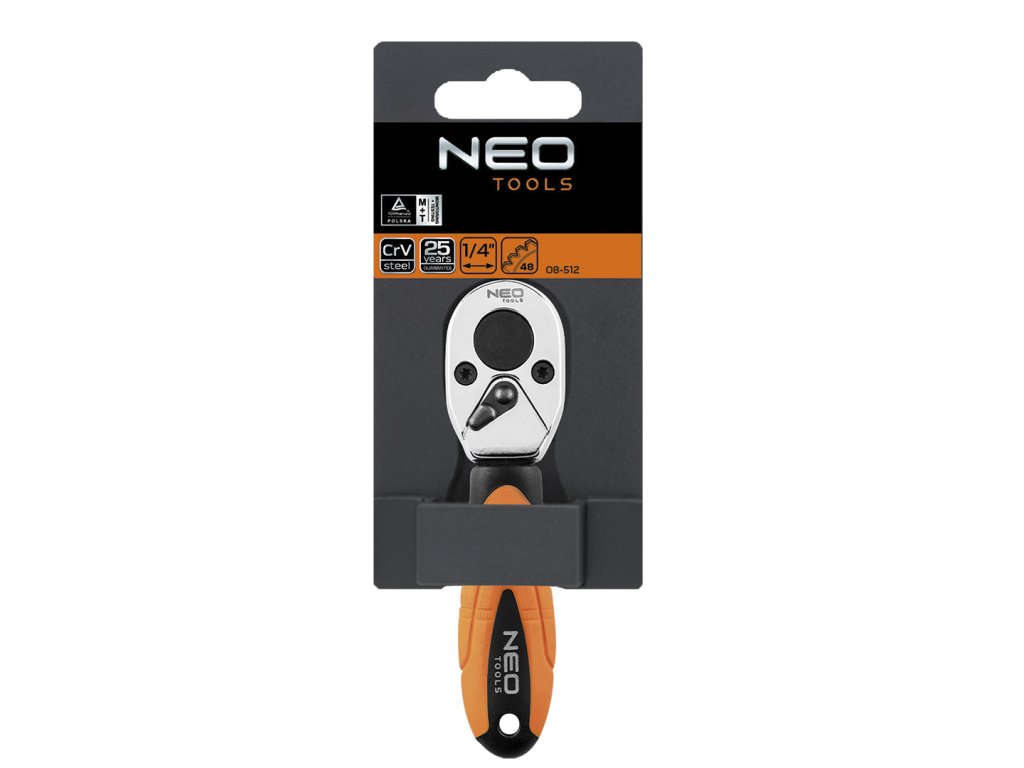 NEO 1/4" bitová račňa (ref. 08-512), 105 mm dlhá, s telom z chróm-vanádiovej ocele. Ráčnový mechanizmus so 48 zubami je vyrobený z mimoriadne odolnej chróm-molybdénovej ocele, čo predlžuje životnosť nástroja. Ergonomická rukoväť z dvoch materiálov pre väčšie pohodlie. Kvalita náradia potvrdená certifikátom TÜV a 25-ročnou zárukou výrobcu. Značka NEO spĺňa očakávania profesionálov.