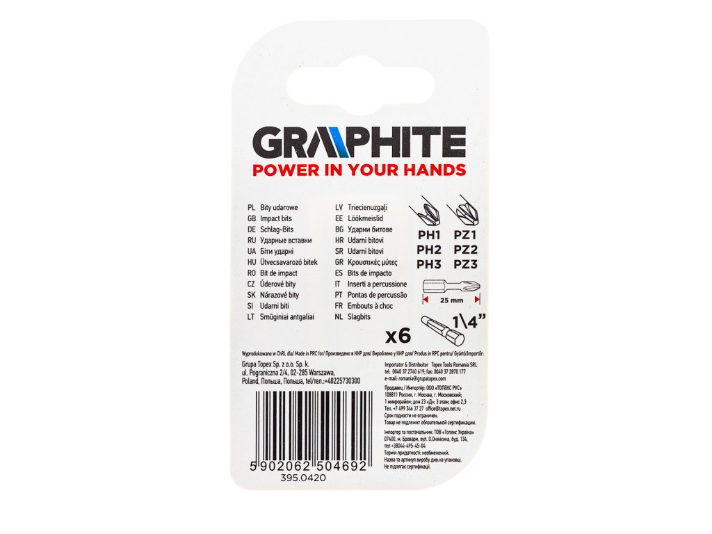 Rázové bity GRAPHITE (ref. 56H540) Typ PH1/2/3, PZ1/2/3, celková dĺžka 25 mm, sú robustné bity určené na použitie pri väčších krútiacich momentoch pomocou skrutkovačov alebo rázových uťahovákov. Vyrobené z vysokokvalitnej ocele S2, ktorá má zvýšenú pružnosť a mechanickú pevnosť. Torzná zóna, ktorá sa otáča pri vysokom krútiacom momente, znižuje prenos sily, vďaka čomu je vrták odolnejší voči zlomeniu a niekoľkonásobne sa predlžuje jeho životnosť. Pracovný koniec bitu zaručuje dokonalé uchytenie. Značka GRAPHITE ponúka široký sortiment elektrického náradia, ktorý spĺňa potreby profesionálov.