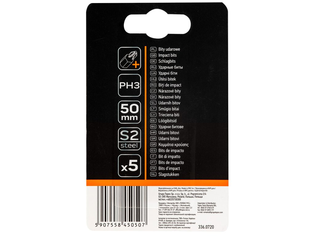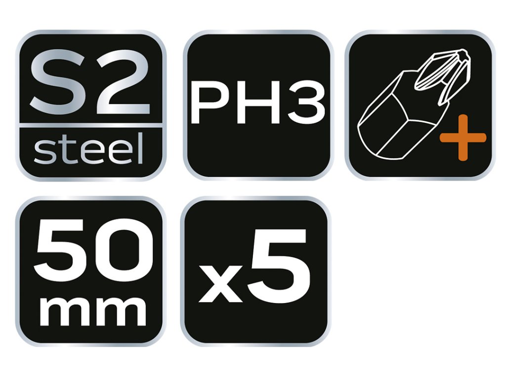 Rázové bity, PH3, celková dĺžka 50 mm, oceľ S2, pohon 1/4", 5 ks.