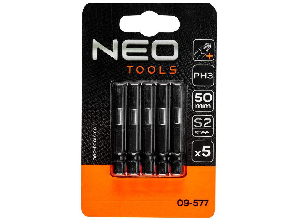 NEO rázové bity (ref. 09-577) je sada 5 profesionálnych rázových bitov typu PH3 s dĺžkou 50 mm. Sú určené pre skrutkovače 1/4". Majú systém, ktorý zabraňuje vykĺznutiu noža zo skrutky. Bity sú vyrobené z ocele S2. Možno dosiahnuť vysoký uťahovací moment 21,8 Nm. Systém absorpcie krútiaceho momentu chráni bity pred rýchlym opotrebovaním a výrazne predlžuje ich životnosť.