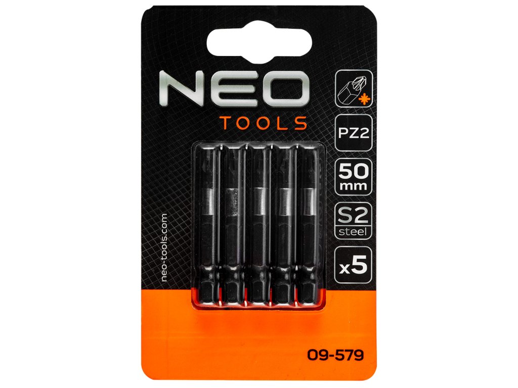 NEO rázové bity (ref. 09-579) je sada 5 profesionálnych rázových bitov typu PZ2 s dĺžkou 50 mm. Sú určené pre skrutkovače 1/4". Majú systém ochrany proti skĺznutiu čepele zo skrutky. Bity sú vyrobené z ocele S2. Možno dosiahnuť vysoký uťahovací moment 21,8 Nm. Systém absorpcie krútiaceho momentu chráni bity pred rýchlym opotrebovaním a výrazne predlžuje ich životnosť.