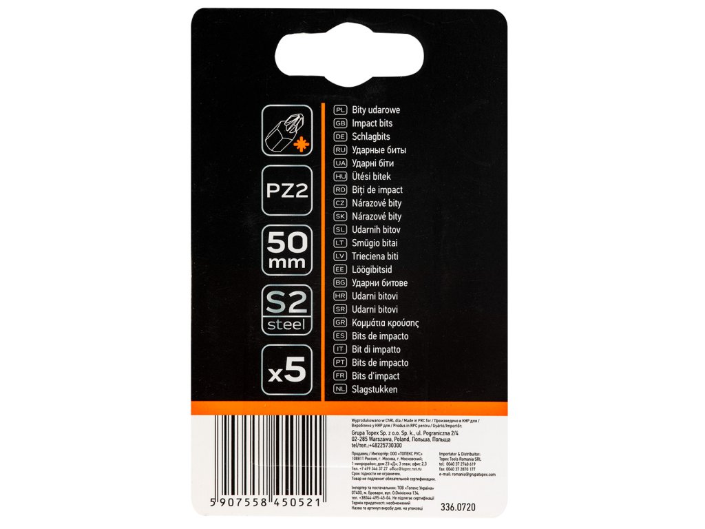 Rázové bity, PZ2, celková dĺžka 50 mm, oceľ S2, pohon 1/4", 5 ks.
