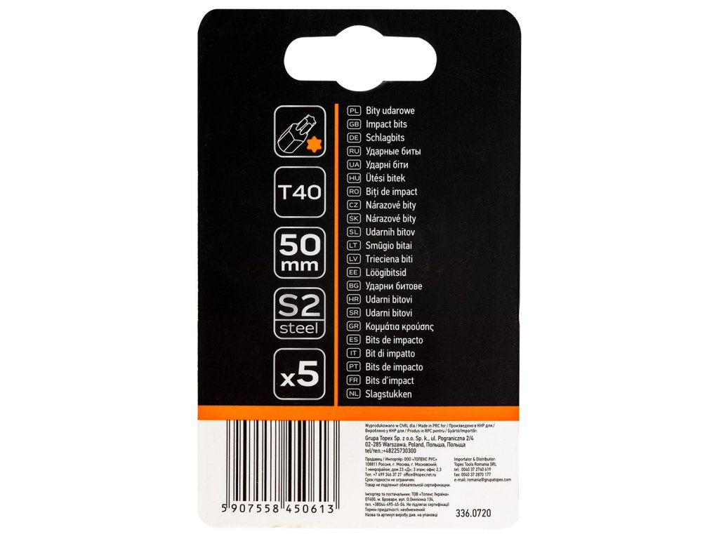 Rázové bity, T40, celková dĺžka 50 mm, oceľ S2, pohon 1/4", 5 ks.