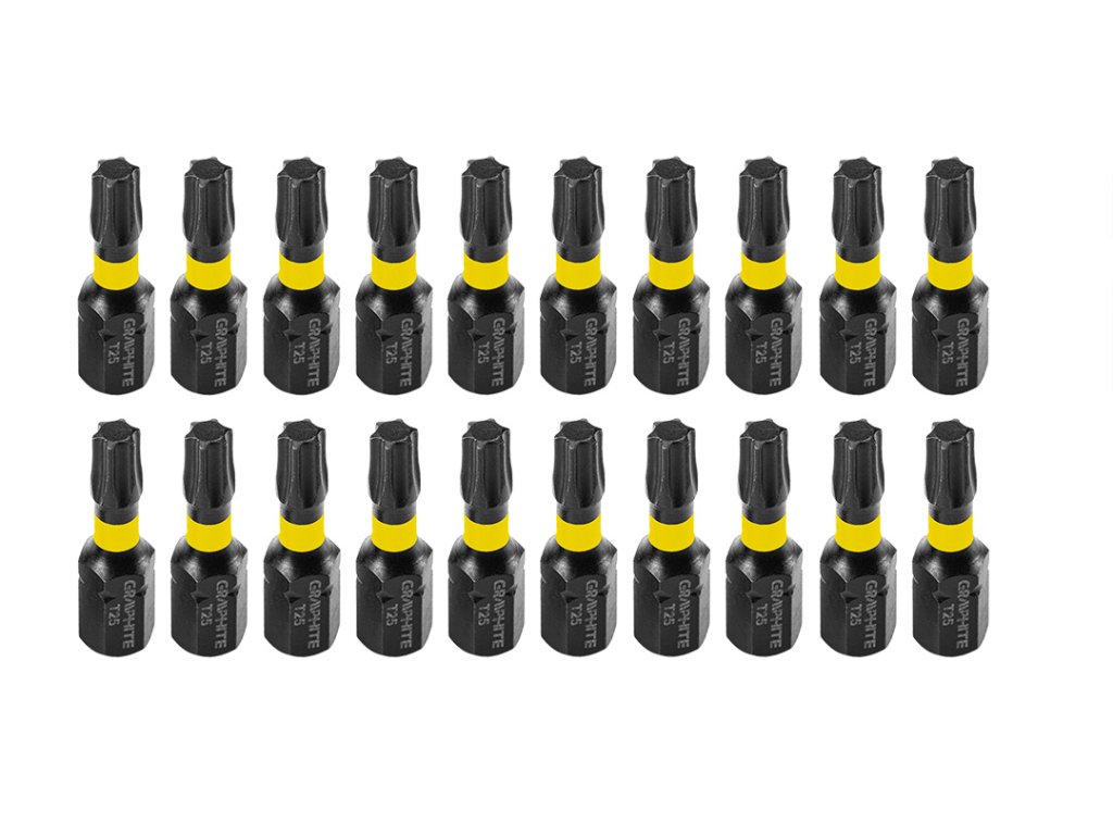 Rázové bity TX25 x 25 mm, 20 kusov 56H546 od GRAPHITE typ TORX 25 s celkovou dĺžkou 25 mm. Odporúčajú sa na ?" pohon a náročné práce s vysokým krútiacim momentom pomocou skrutkovačov alebo rázových uťahovákov. Rázové bity sú vyrobené z odolnej ocele S2. Sada ponúka 20 kusov pre profesionálov a domácich majstrov.