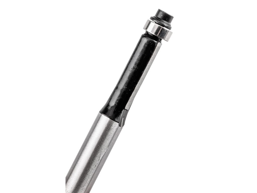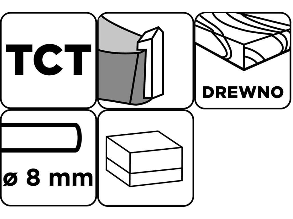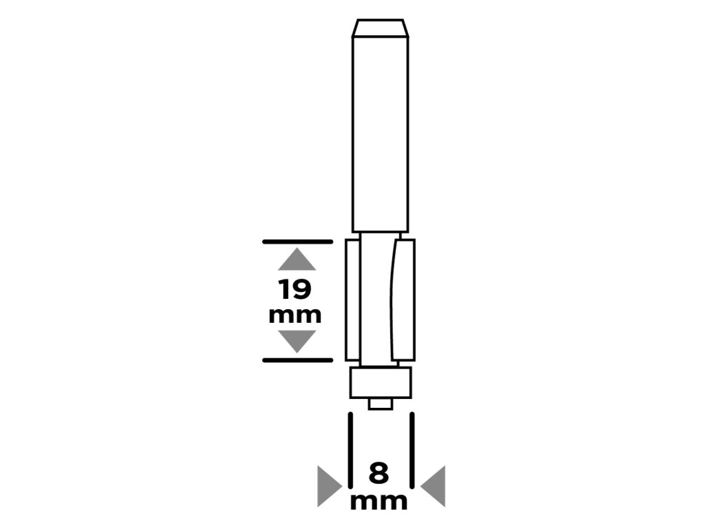 Rovný frézovací vrták do dreva s ložiskom, obojstranné ostrie, čepeľ z karbidu volfrámu (TCT), priemer stopky 8 mm, priemer čepele 8 mm, výška čepele 19 mm, celková dĺžka 65 mm, použitie drevo,