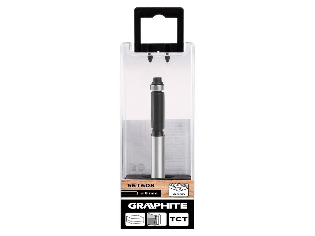 Rovný frézovací bit do dreva s ložiskom, widia, 8 x 19 mm, stopka 8 mm 56T608 od spoločnosti GRAPHITE je frézovací bit s odskrutkovateľným ložiskom, s priemerom čepele 8 mm, výškou 19 mm a celkovou dĺžkou 65 mm. Je vybavený stopkou s priemerom 8 mm. Fréza je vyrobená z karbidu volfrámu (TCT), čo zaručuje odolnosť a presnosť. Vďaka dvom rezným hranám je ideálna na vytváranie rovných drážok, drážok a drážok. Rovný profil umožňuje hladké opracovanie hrán. Je určený na opracovanie dreva, a preto je vhodný na stolárske a nábytkárske práce.