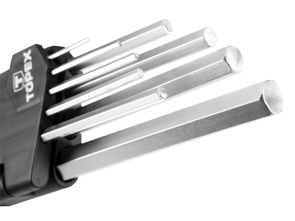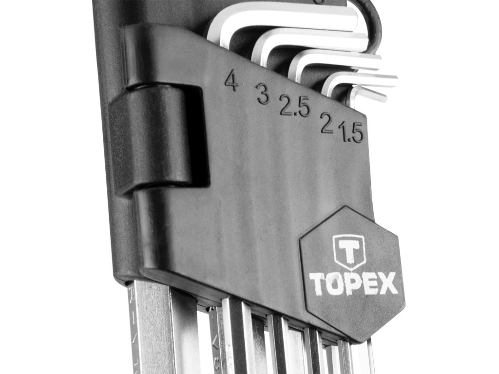 TOPEX dlhé šesťhranné kľúče (ref. 35D956) vo veľkostiach 1,5-10 mm. Vyrobené z odolnej chróm-vanádiovej ocele, ktorá zaručuje dlhú životnosť výrobku. Praktický plastový obal s označenou priehradkou pre každý kľúč uľahčuje ich skladovanie. Značka TOPEX je určená pre domácich majstrov.