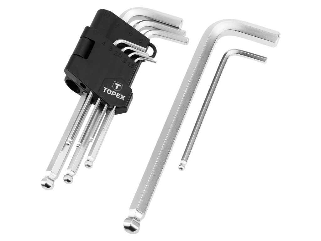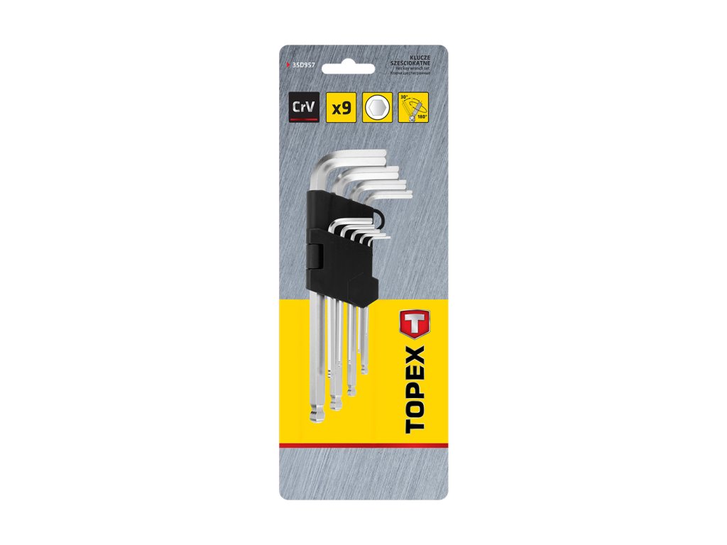 TOPEX dlhé šesťhranné kľúče (ref. 35D957) vo veľkostiach 1,5 - 10 mm. Vyrobené z odolnej chróm-vanádiovej ocele, ktorá zaručuje dlhú životnosť výrobku. Sférické hroty s pracovným uhlom 30° umožňujú prácu na ťažko dostupných miestach. Praktický plastový obal s označenou priehradkou pre každý kľúč uľahčuje ich skladovanie. Značka TOPEX je určená pre domácich majstrov.