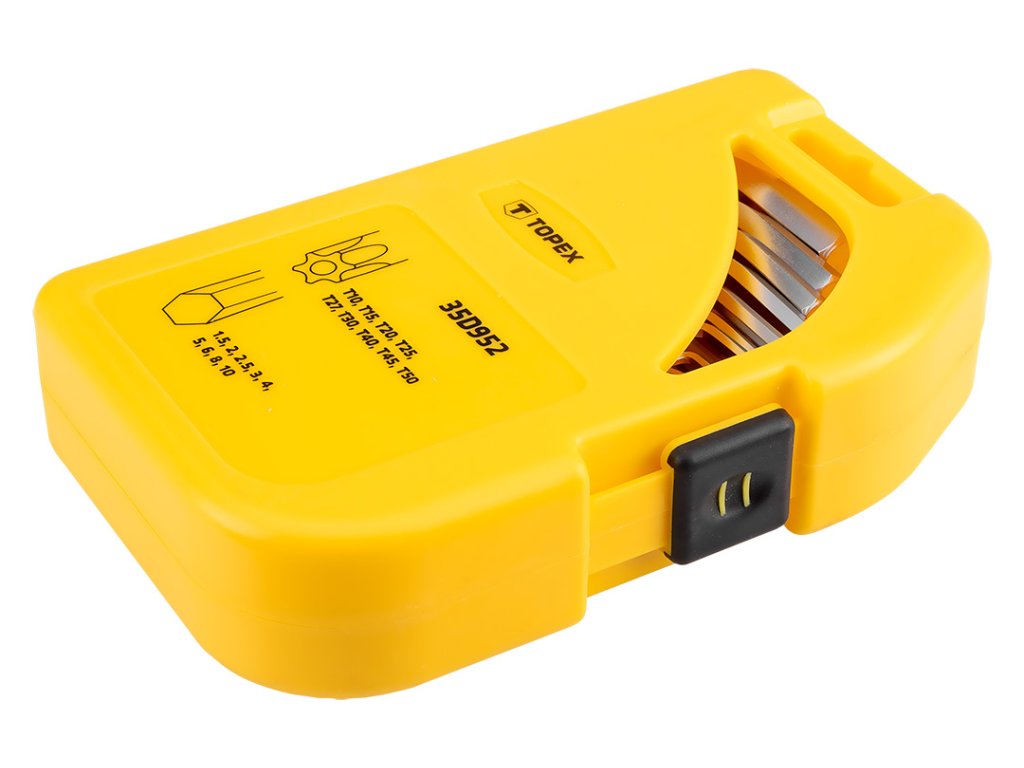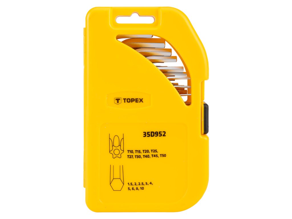 Sada krátkych šesťhranných a torx kľúčov TOPEX (ref. 35D952) veľmi užitočná pri mechanických prácach a kutilstve. Vyrobené z odolnej chróm-vanádiovej ocele, ktorá zaručuje dlhú životnosť výrobku. Praktický plastový obal s priehradkou pre každý prvok uľahčuje ich skladovanie. Značka TOPEX je určená pre domácich majstrov.