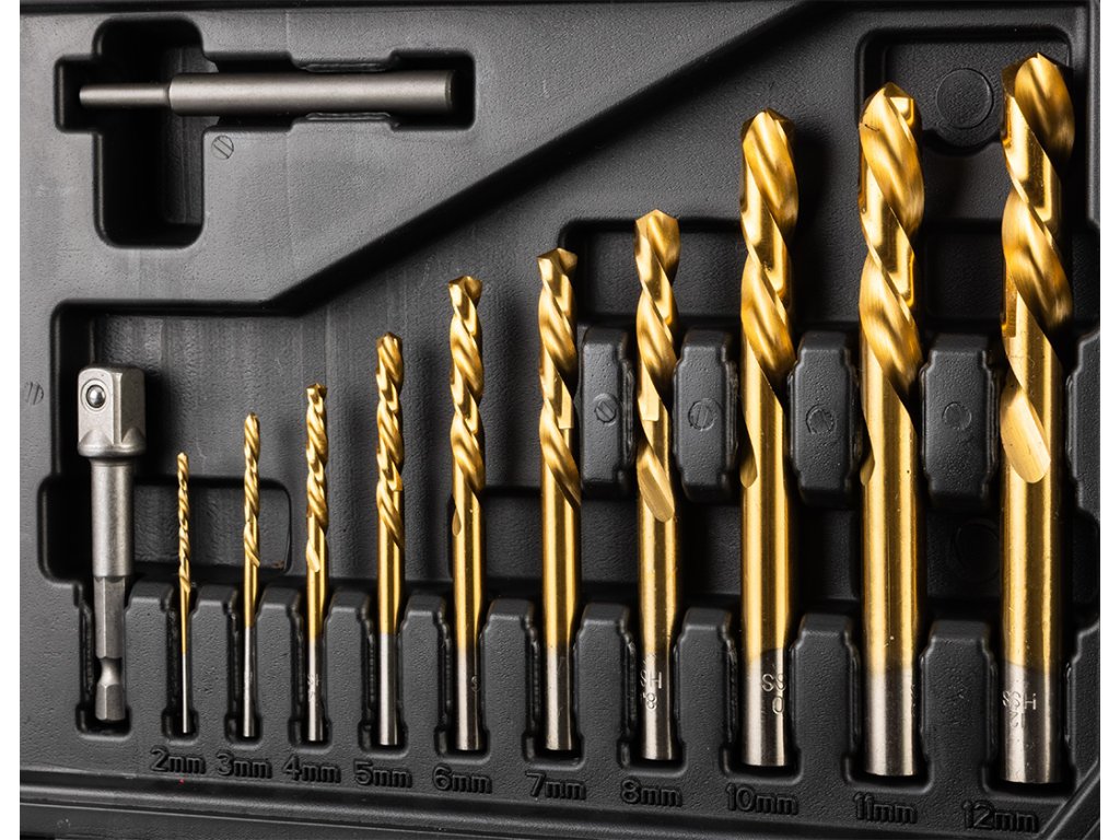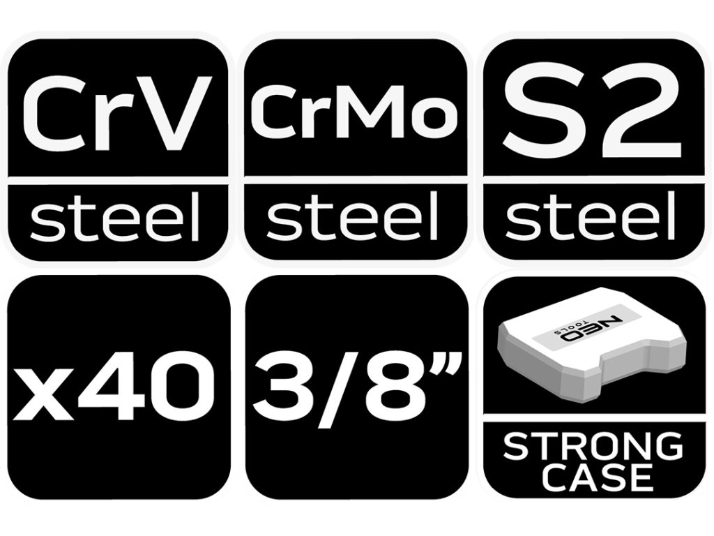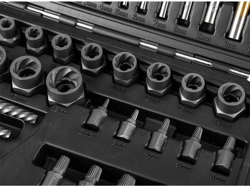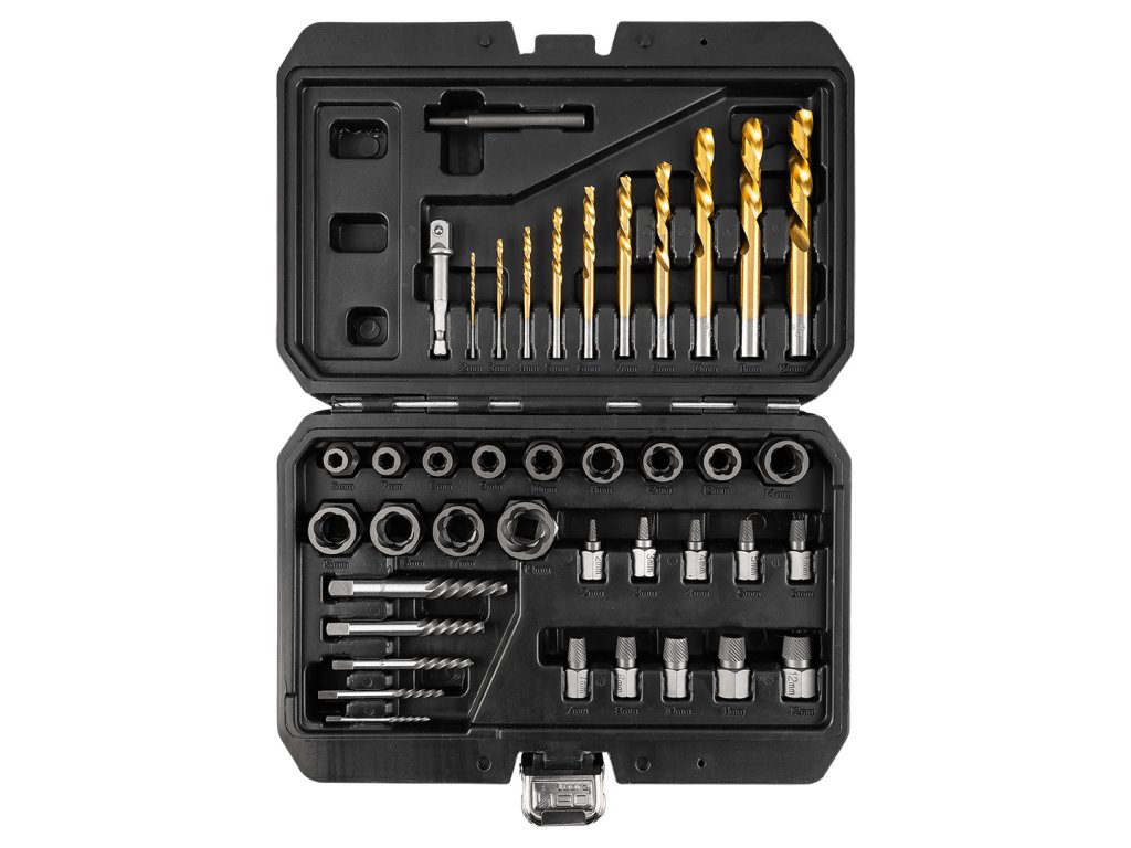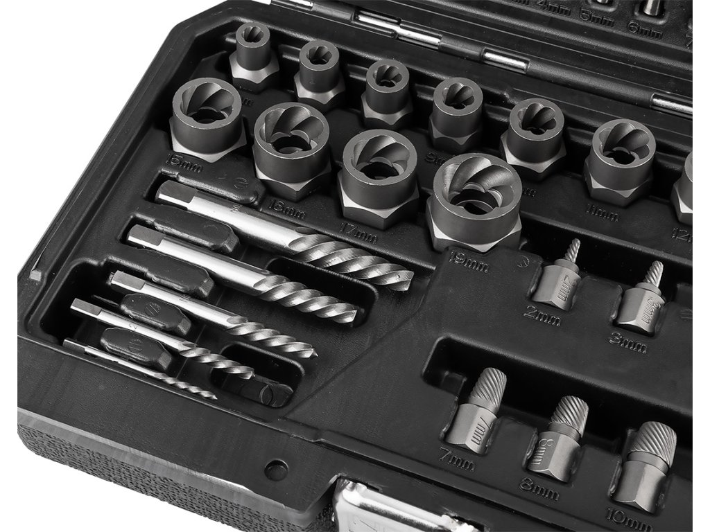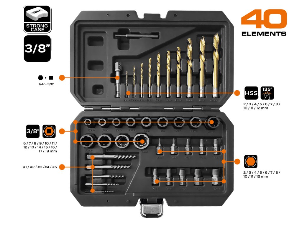 Sada zlomených skrutiek, 40 kusov, vrtáky do kovu (10 ks): 2, 3, 4, 5, 6, 7, 8, 10, 11, 12 mm; dlhé skrutkovače (5 ks); ; skrutkovače (nástrčky) na zlomené matice 3/8" (13 ks): 6, 7, 8, 9, 10, 11, 12, 13, 14, 15, 16, 17, 19 mm; odskrutkovače (10 ks): 2, 3, 4, 5, 6, 7, 8, 10, 11, 12 mm; adaptér pre nástrčné hlavice: ?" šesťhran -> 3/8" štvorhran (1 ks); dierovač (1 ks); materiál: CRV, CrMo, S2.