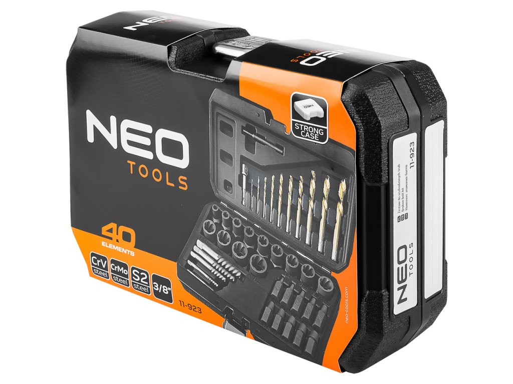 Sada na odstraňovanie zlomených skrutiek (s vrtákmi a skrutkami), 40 kusov 11-923 od spoločnosti NEO TOOLS je komplexná sada na odstraňovanie zlomených skrutiek, čapov alebo matíc. Vysokokvalitné, laboratórne testované príslušenstvo ponúka dve možnosti použitia nástrčných hlavíc - s kľúčom alebo s kľučom (račňou/nástavcom) so štvorhranom 3/8". Vyznačujú sa vysokou kvalitou spracovania a metrickou veľkosťou nástrčiek (mm). Ľahko sa používajú a sú účinné. Nástrčné hlavice možno používať s rázovými kľúčmi. Súprava značky NEO TOOLS obsahuje: vrtáky do kovu10 ks: 2, 3, 4, 5, 6, 7, 8, 10, 11, 12 mm, adaptér pre nástrčné hlavice: ?" Hex -> 3/8" štvorhran, dierovače kolíkov, 5 ks, unášač 1 ks, dierovače (nástrčné hlavice) na poškodené matice, 13 ks, 3/8": 6, 7, 8, 9, 10, 11, 12, 13, 14, 15, 16, 17, 19 mm, dierovače na zlomené skrutky: 2, 3, 4, 5, 6, 7, 8, 10, 11, 12 mm. Vyrobené z materiálov CRV CRMO S2, vydržia mesiace používania.