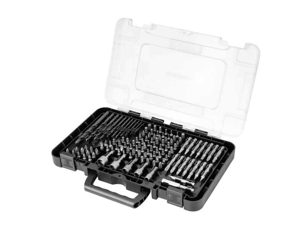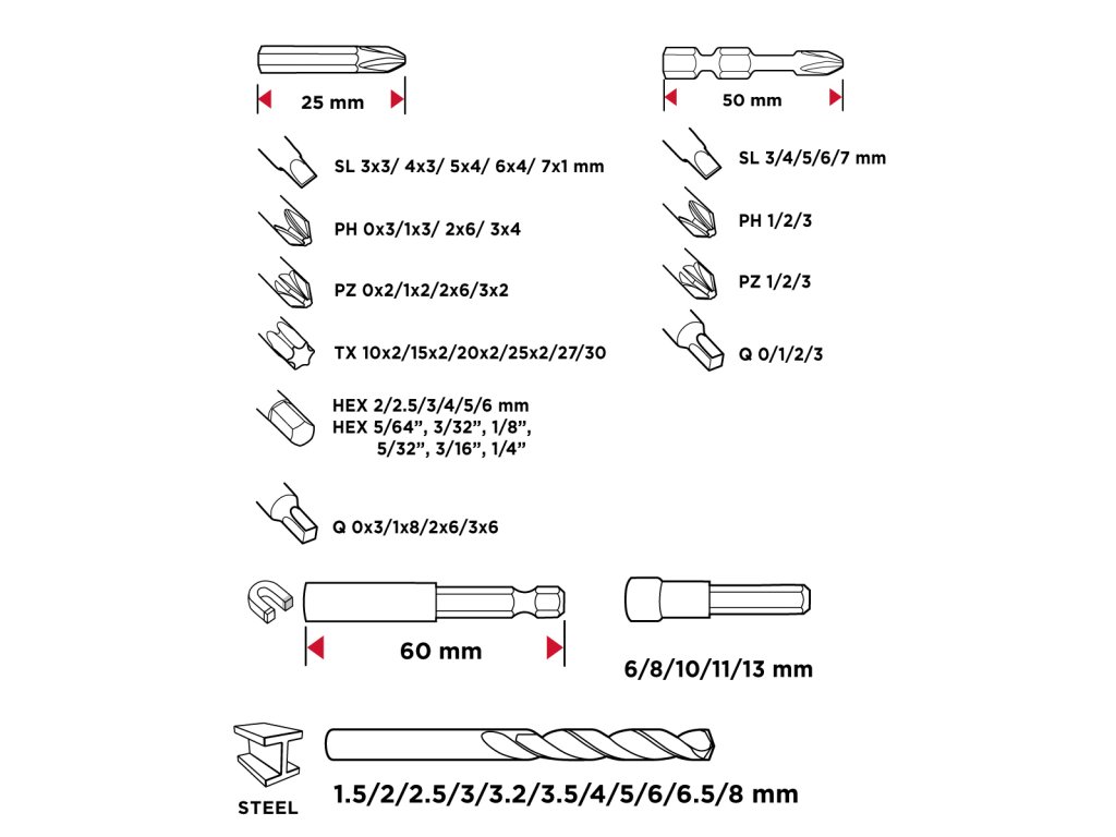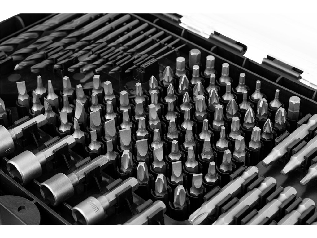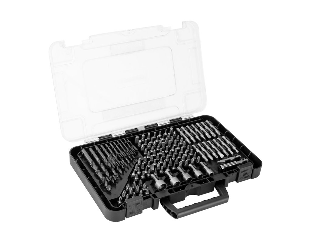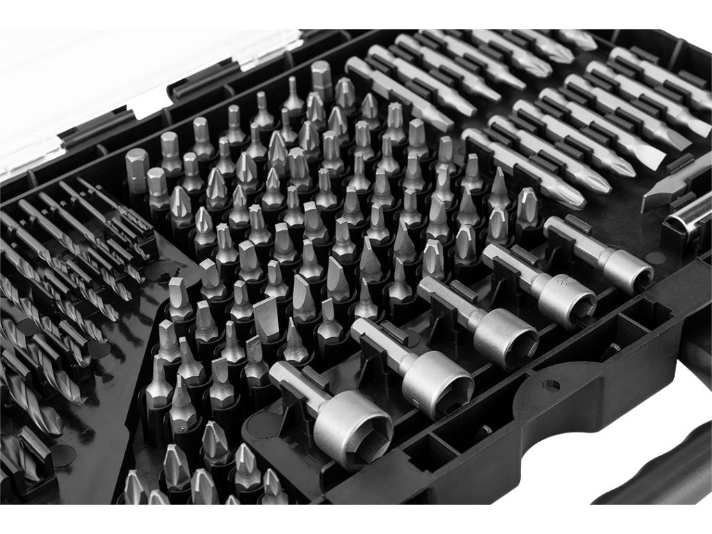 Sada vrtákov a bitov, 120 ks. - Vrtáky do kovu, 11 ks: 1,5, 2, 2,5, 3, 3,2, 3,5, 4, 5, 6, 6,5, 8 mm; bity 25 mm, 88 ks: SL 3x3/4x3/5x4/6x4/7x1 mm; PH 0x3/1x3/2x6/3x4 mm; PZ 0x2/1x2/2x6/3x2 mm; TX 10x2/15x2/20x2/25x2/27/30 mm; HEX 2x2/2,5x2/3x2/4x2/5x2/6x2/6x2 mm; Q 0x3/1x8/2x6/3x6; bity 50 mm, 15 ks: SL 3/4/5/6/7 mm; PH 1/2/3 mm; PZ 1/2/3 mm; Q 1/1/2/3 mm; bity, 5 ks: 1 ks: 6, 8, 10, 11, 13 mm; magnetický držiak bitov 60 mm, 1 ks.
