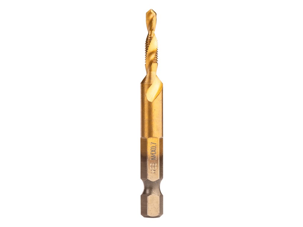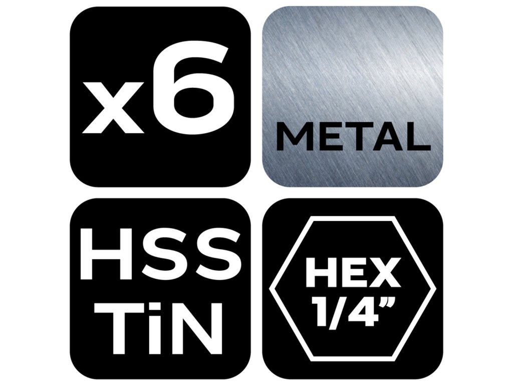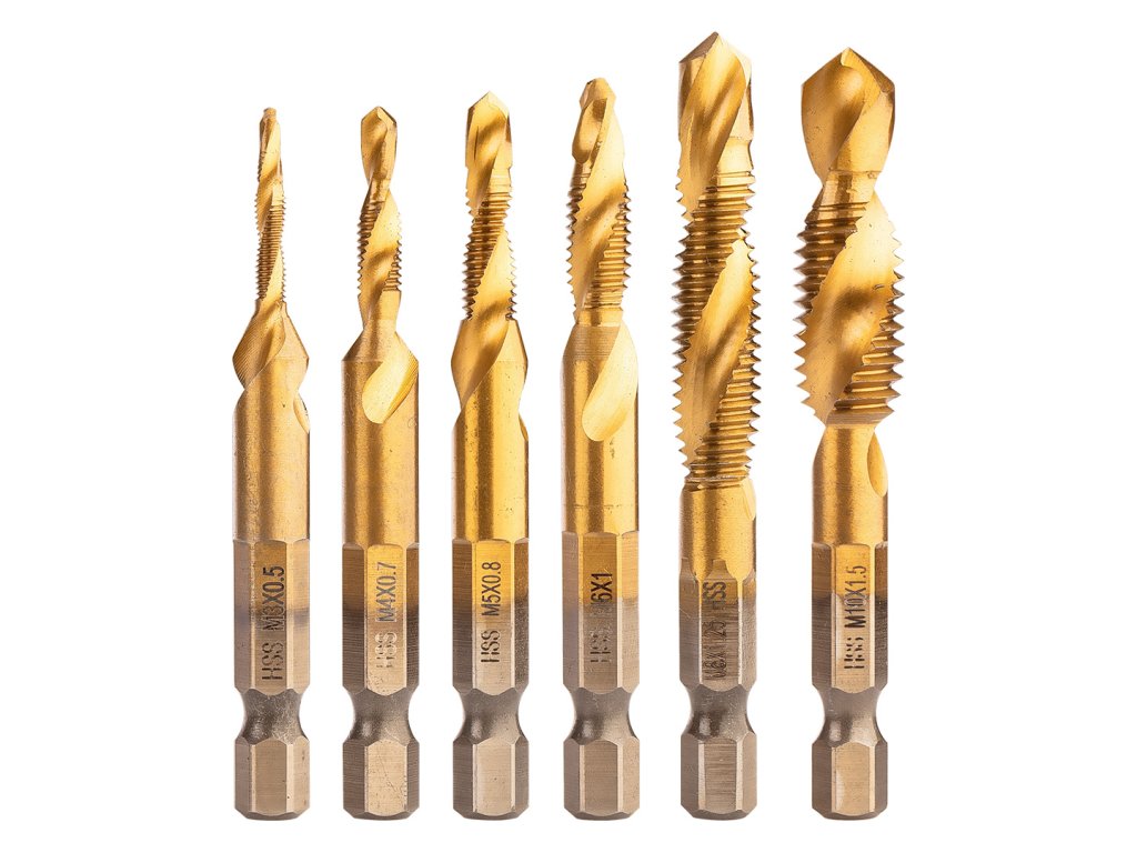 Sada šiestich závitových vrtákov, materiál: HSS, povlak TiN, stopka 1/4 Hex, maximálne otáčky 1000 ot/min, typy závitov: M3x0,5 mm; M4x0,7 mm; M5x0,8 mm; M6x1 mm; M8x1,25 mm; M10x1,5 mm.