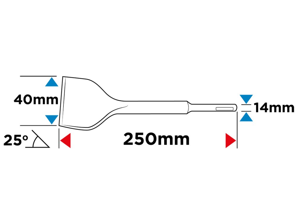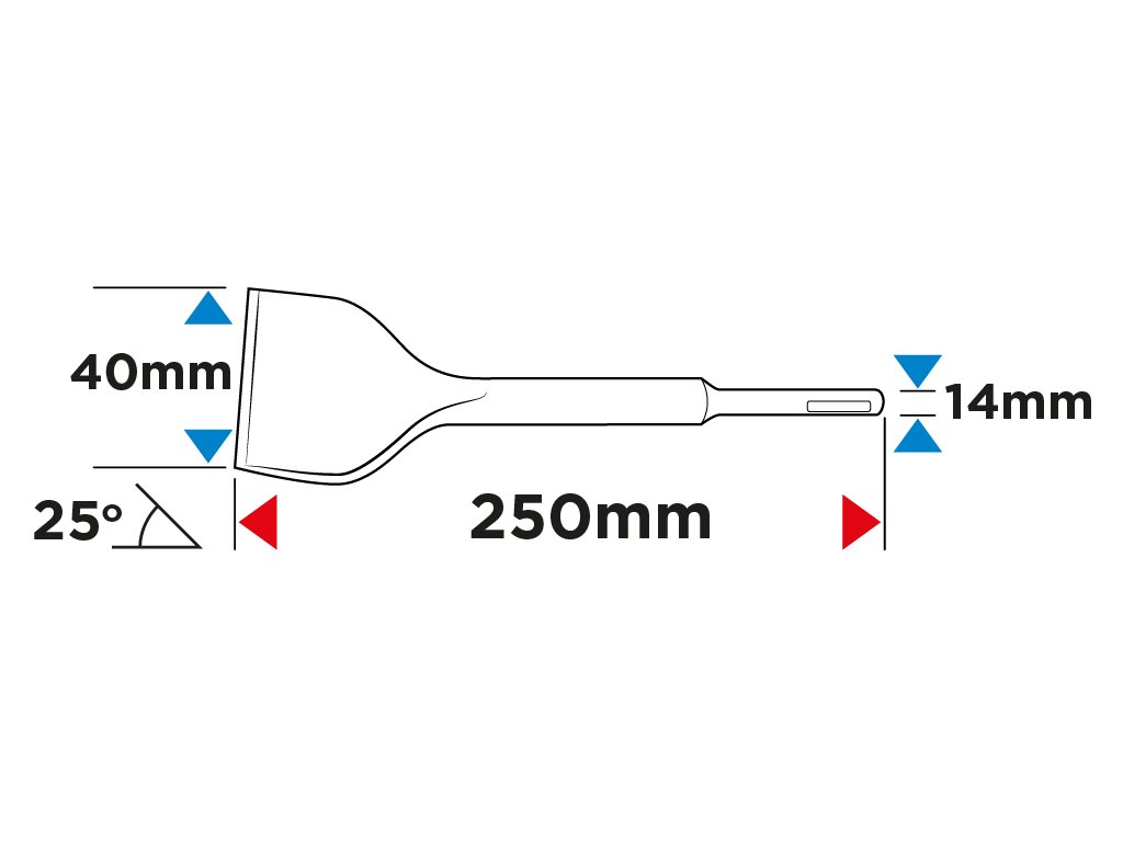 Sekáč SDS Plus, šírka 40 mm, priemer stopky 14 mm, dĺžka 250 mm, uhol sklonu 25 stupňov
