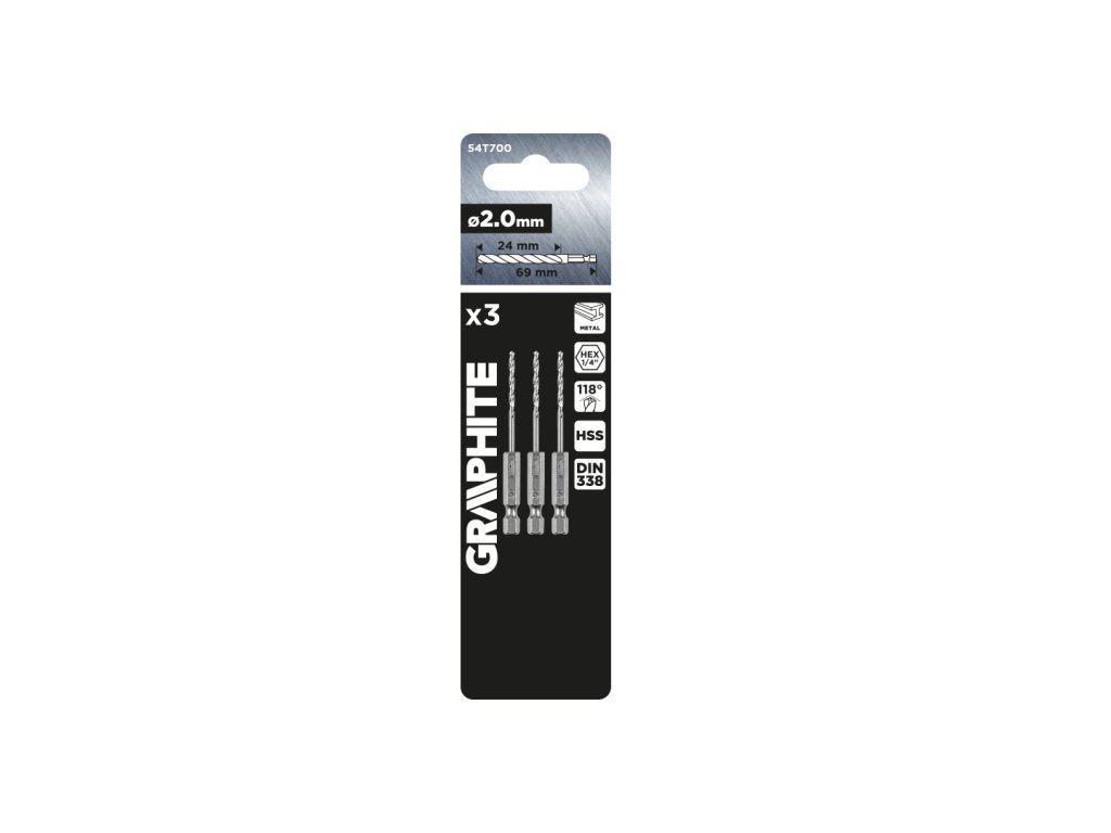 Šesťhranné vrtáky do kovu 2,0 mm, 3 kusy 54T700 od spoločnosti GRAPHITE je sada 3 kusov vrtákov na prácu s kovmi. Tento vrták má priemer 2 mm a rozmery - celkovú dĺžku 69 mm a pracovnú dĺžku 24 mm. Je v súlade s normou DIN 338 a má uhol hrotu 118 stupňov. Vrtáky značky GRAPHITE sa dobre osvedčujú pri amatérskom aj amatérskom použití.