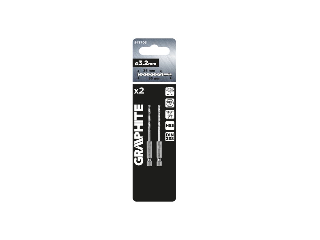 Šesťhranný vrták do kovu 3,2 mm, 2 kusy 54T703 od spoločnosti GRAPHITE je sada 2 kusov vrtákov na prácu s kovmi. Tento vrták má priemer 3,2 mm a rozmery - celkovú dĺžku 85 mm a pracovnú dĺžku 36 mm. Je v súlade s normou DIN 338 a má uhol hrotu 118 stupňov. Vrtáky značky GRAPHITE sa dobre osvedčujú pri amatérskych aplikáciách.