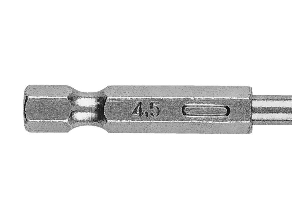 Šesťhranný vrták do kovu s priemerom 4,5 mm, 2 ks v balení, celková dĺžka 100 mm, pracovná dĺžka 47 mm. Norma DIN 338, uhol hrotu 118 stupňov.
