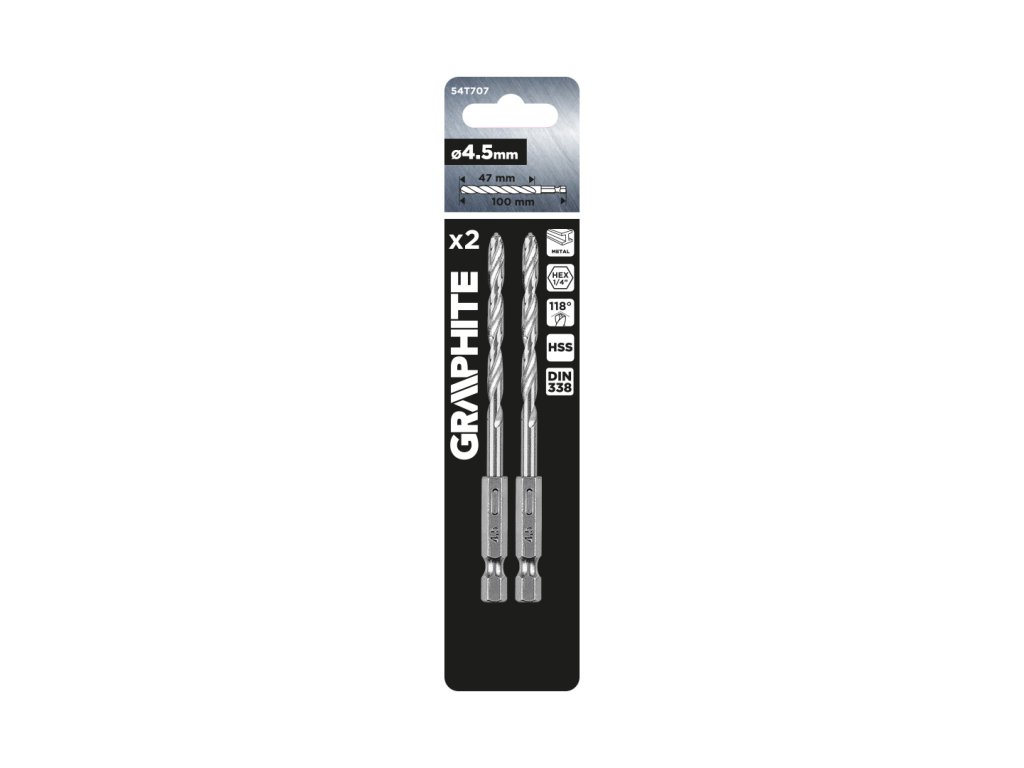 Šesťhranný vrták do kovu 4,5 mm, 2 kusy 54T707od GRAPHITE je sada 2 kusov vrtákov na prácu s kovmi. Tento vrták má priemer 4,5 mm a rozmery - celkovú dĺžku 100 mm a pracovnú dĺžku 47 mm. Je v súlade s normou DIN 338 a má uhol hrotu 118 stupňov. Vrtáky značky GRAPHITE sa dobre osvedčujú pri amatérskych aplikáciách.