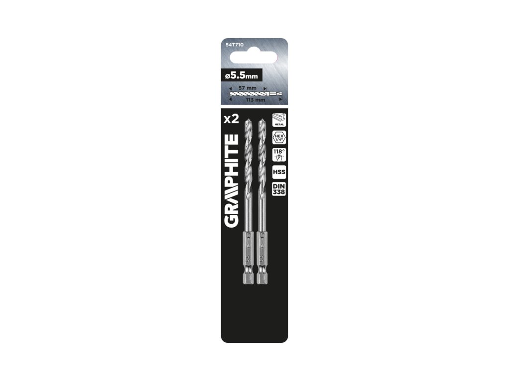 Šesťhranný vrták do kovu 5,5 mm, 2 kusy 54T710 od spoločnosti GRAPHITE je sada 2 kusov vrtákov na prácu s kovmi. Tento vrták má priemer 5,5 mm a rozmery - celkovú dĺžku 113 mm a pracovnú dĺžku 57 mm. Je v súlade s normou DIN 338 a má uhol hrotu 118 stupňov. Vrtáky značky GRAPHITE sú vhodné na amatérske použitie.