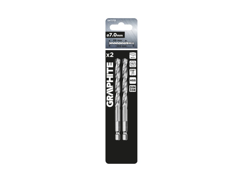 Šesťhranný vrták do kovu 7,0 mm, 2 kusy 54T713 od spoločnosti GRAPHITE je sada 2 kusov vrtákov na prácu s kovmi. Tento vrták má priemer 7 mm a rozmery - celkovú dĺžku 109 mm a pracovnú dĺžku 69 mm. Je v súlade s normou DIN 338 a má uhol hrotu 118 stupňov. Vrtáky značky GRAPHITE sa výborne hodia na amatérske použitie.