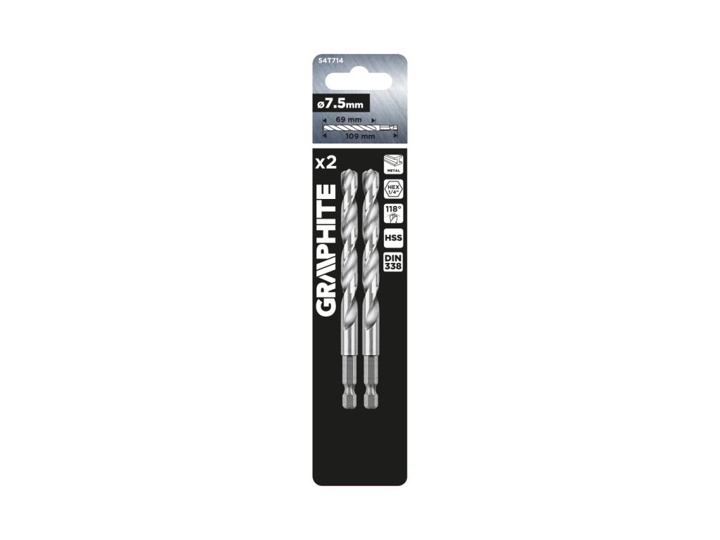 Šesťhranný vrták do kovu 7,5 mm, 2 kusy 54T714 od spoločnosti GRAPHITE je sada 2 kusov vrtákov na prácu s kovmi. Tento vrták má priemer 7,5 mm a rozmery - celkovú dĺžku 109 mm a pracovnú dĺžku 69 mm. Je v súlade s normou DIN 338 a má uhol hrotu 118 stupňov. Vrtáky značky GRAPHITE sa dobre osvedčujú pri amatérskom použití.