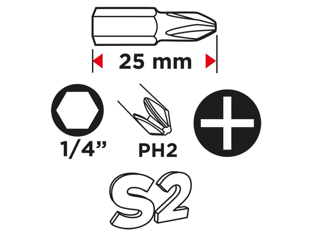 Skrutkovacie bity PH2 x 25 mm, 1/4", oceľ S2, sada 100 ks.