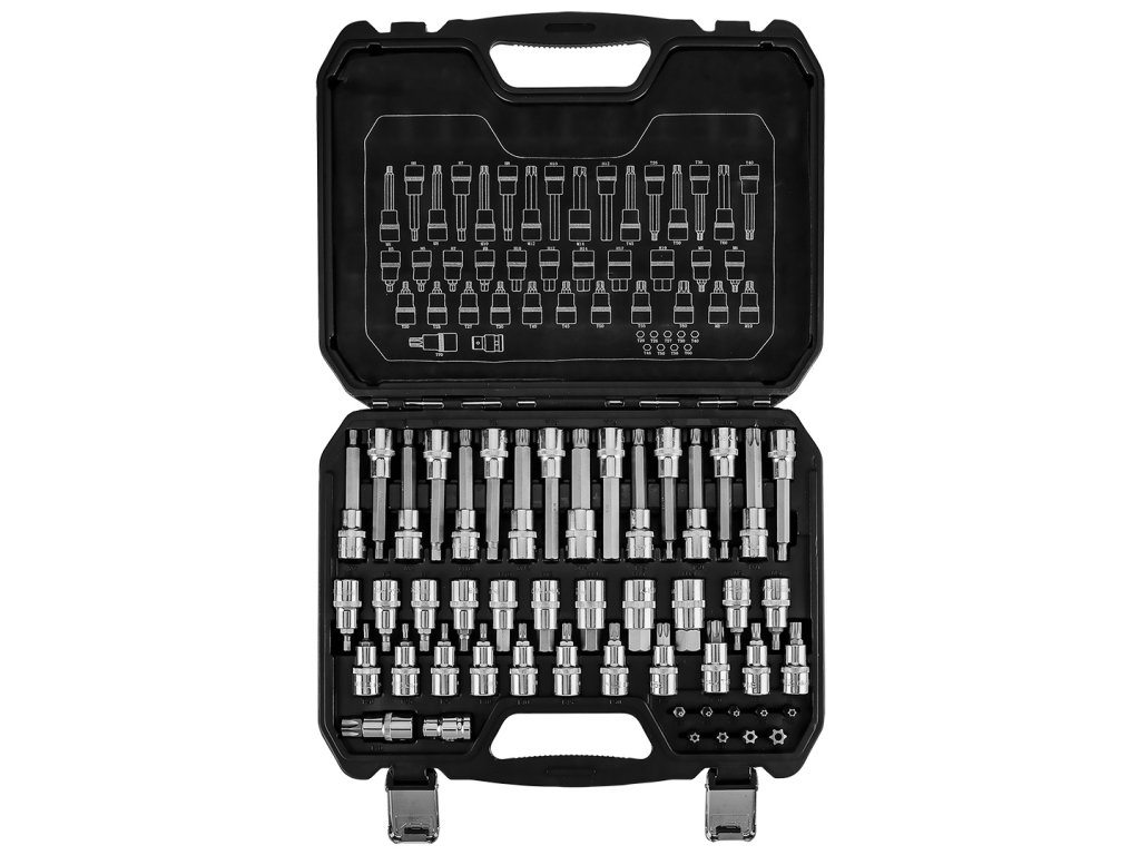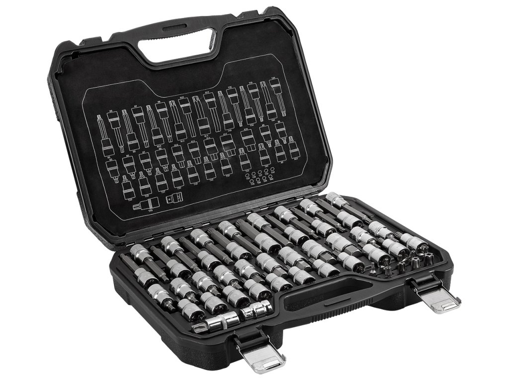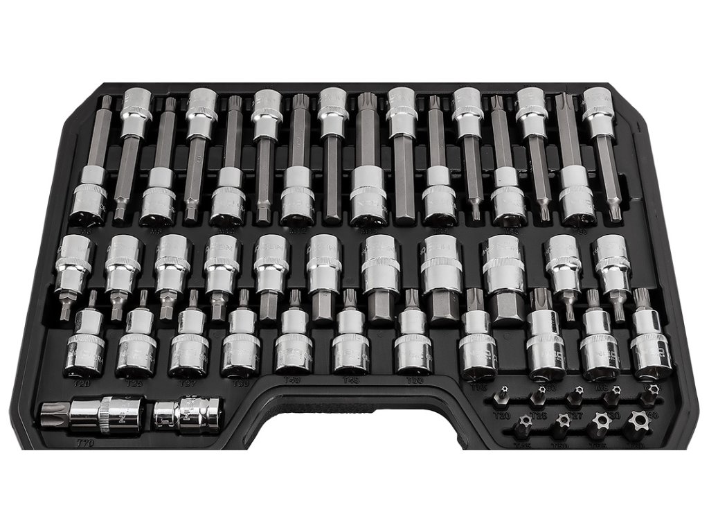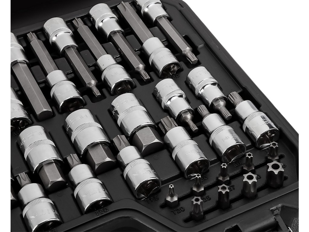 Sada bitov Torx 49 kusov, dlhé bity na zásuvke: H6, H7, H8, H10, H12, T25, T30, T40, T45, T50, T60, krátke bity na zásuvke: H5, H6, H7, H8, H10, H12, H14, H17, H19, bity Torx s 1/4" otvorom: T20, T25, T30, T40, T45, T50, T55, T60, zásuvky z CrV ocele, bity z ocele S2, certifikát TÜV M+T, záruka 25 rokov