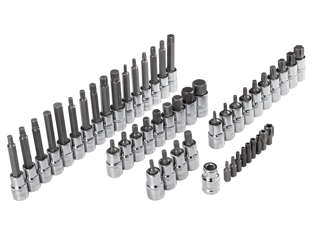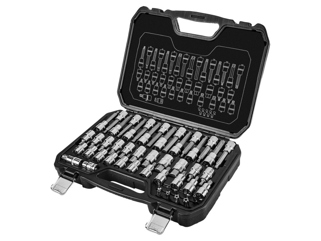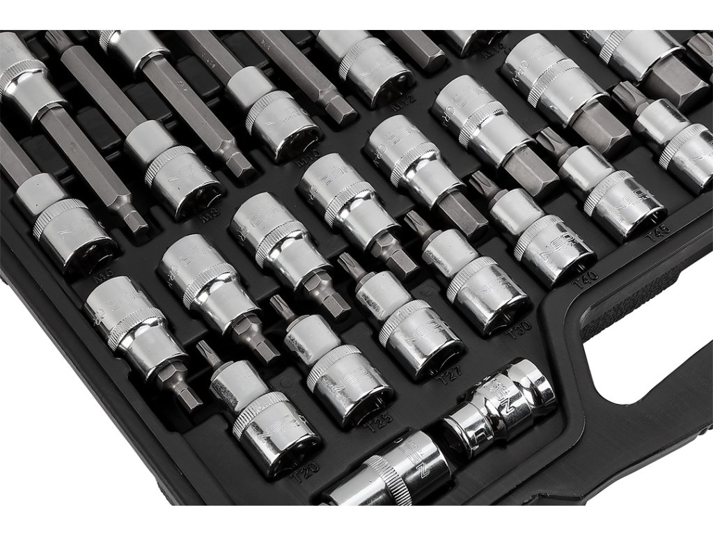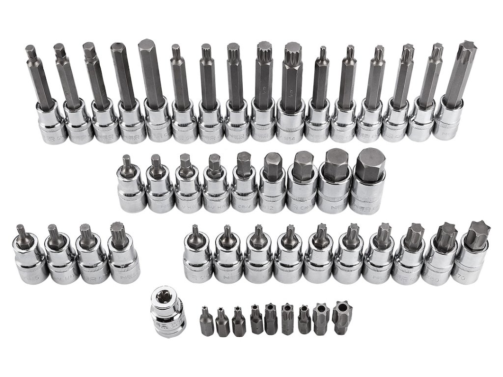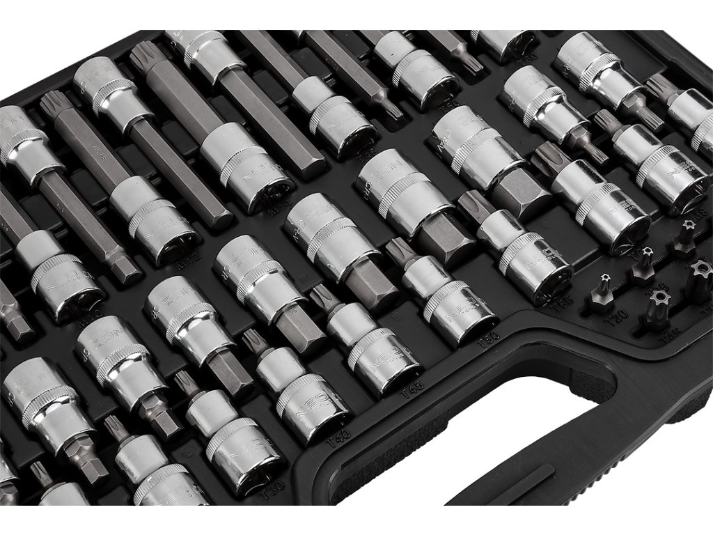 Sada bitov Torx 49 kusov, dlhé bity na zásuvke: H6, H7, H8, H10, H12, T25, T30, T40, T45, T50, T60, krátke bity na zásuvke: H5, H6, H7, H8, H10, H12, H14, H17, H19, bity Torx s 1/4" otvorom: T20, T25, T30, T40, T45, T50, T55, T60, zásuvky z CrV ocele, bity z ocele S2, certifikát TÜV M+T, záruka 25 rokov