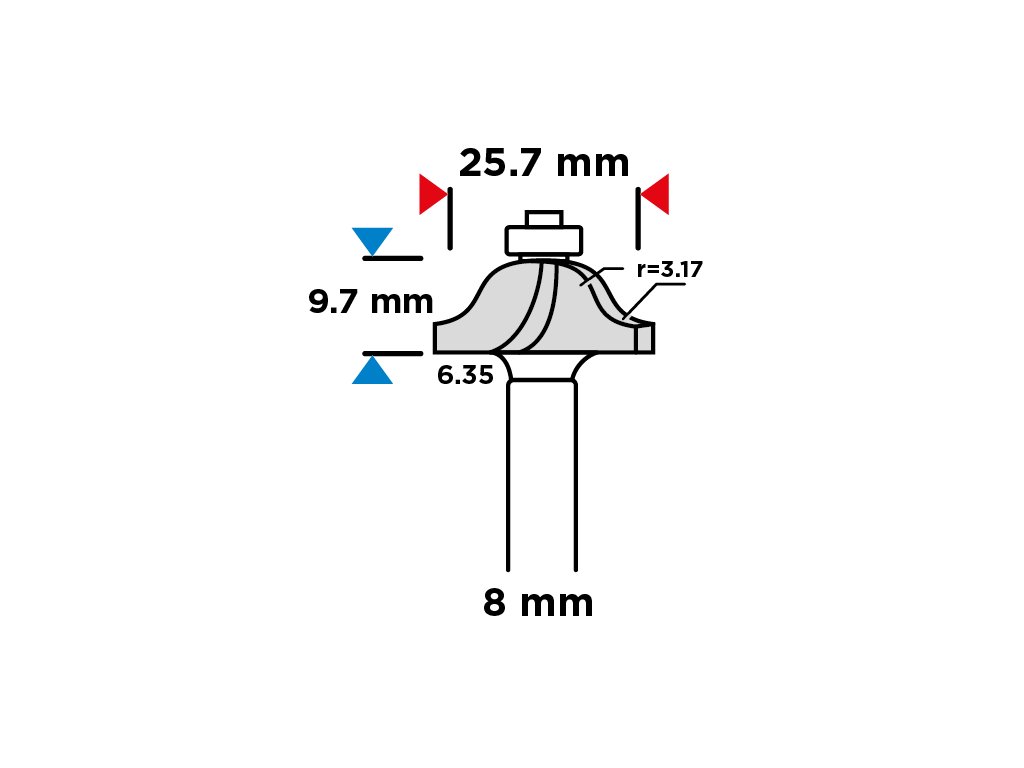 Tvarová fréza s ozdobným ložiskom, tvrdokovová doštička, priemer vyvrtávania 25.7 mm, pracovná dĺžka frézy 9,7 mm, priemer stopky 8 mm, na drevo