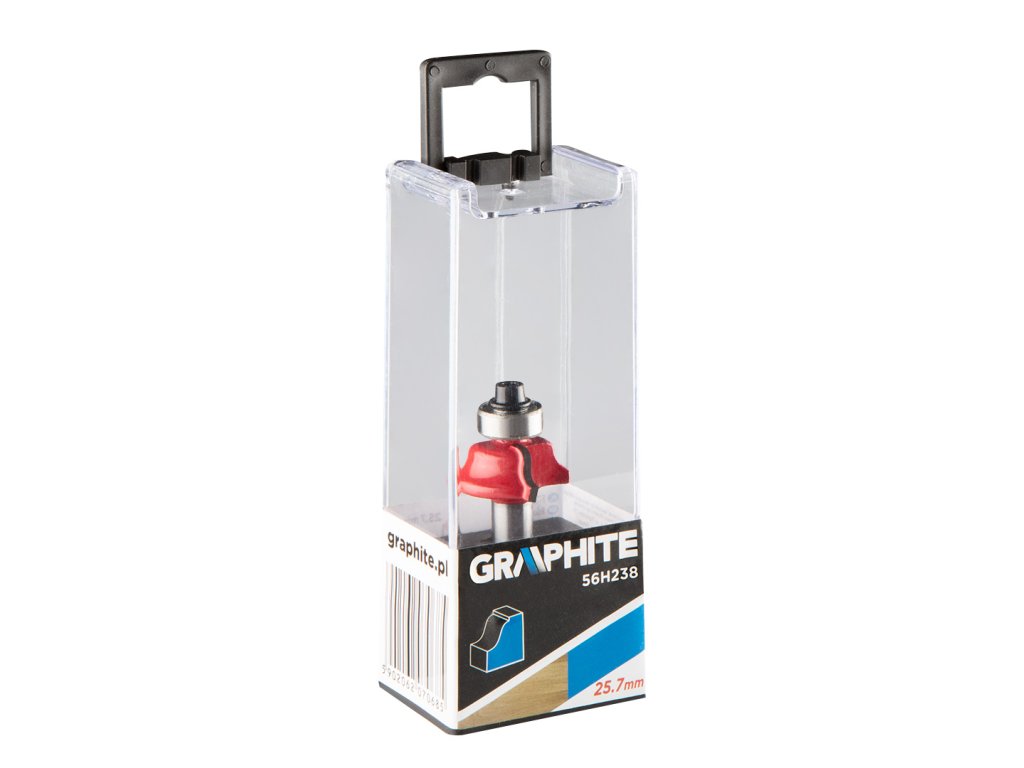 Ramenná fréza s ložiskom, ozdobná, HM, 25,7 x 9,7 mm, stopka 8 mm GRAPHITE (ref. 56H238) určená na presné obrábanie napr. dreva, PVC, drevotrieskových dosiek pomocou vretenových fréz. Hlava je vybavená reznými doštičkami zo spekaného karbidu. Fréza je vybavená ložiskom, ktoré uľahčuje vedenie frézy. Rozmery pracovnej časti: priemer 25,7 mm, výška 9,7 mm; priemer drieku 8 mm.