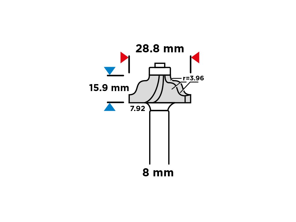 Tvarová fréza s ozdobným ložiskom, s vložkou z karbidu volfrámu (HM), pracovný priemer frézy 28,8 mm, pracovná dĺžka frézy 15,9 mm, priemer stopky 8 mm, na drevo