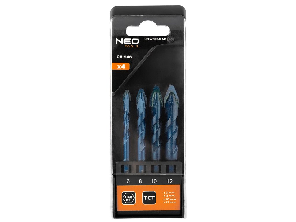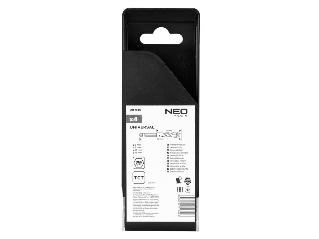 Sada univerzálnych vrtákov HEX 6, 8, 10, 12 mm 08-946 od spoločnosti NEO TOOLS je sada štyroch vrtákov s priemerom 6, 8, 10 a 12 mm so stopkou HEX. Vrtáky sú vyrobené z uhlíkovej ocele a karbidu (čepele). Sú galvanicky pokovované, aby odolávali korózii a mali dlhšiu životnosť. Odporúčajú sa pre domácich majstrov na rôzne úlohy.