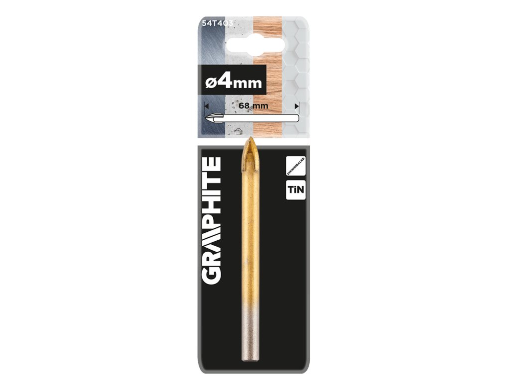 Univerzálny vrták 54T403 s TiN povlakom, 4 mm od spoločnosti GRAPHITE je vrták s TiN povlakom a je vybavený valcovým skľučovadlom. Má priemer 4 mm a celkovú dĺžku 68 mm. Maximálna rýchlosť otáčania je 1000 otáčok za minútu. Univerzálny vrták GRAPHITE je určený na použitie do dreva, kovu, betónu, keramiky a plastov.