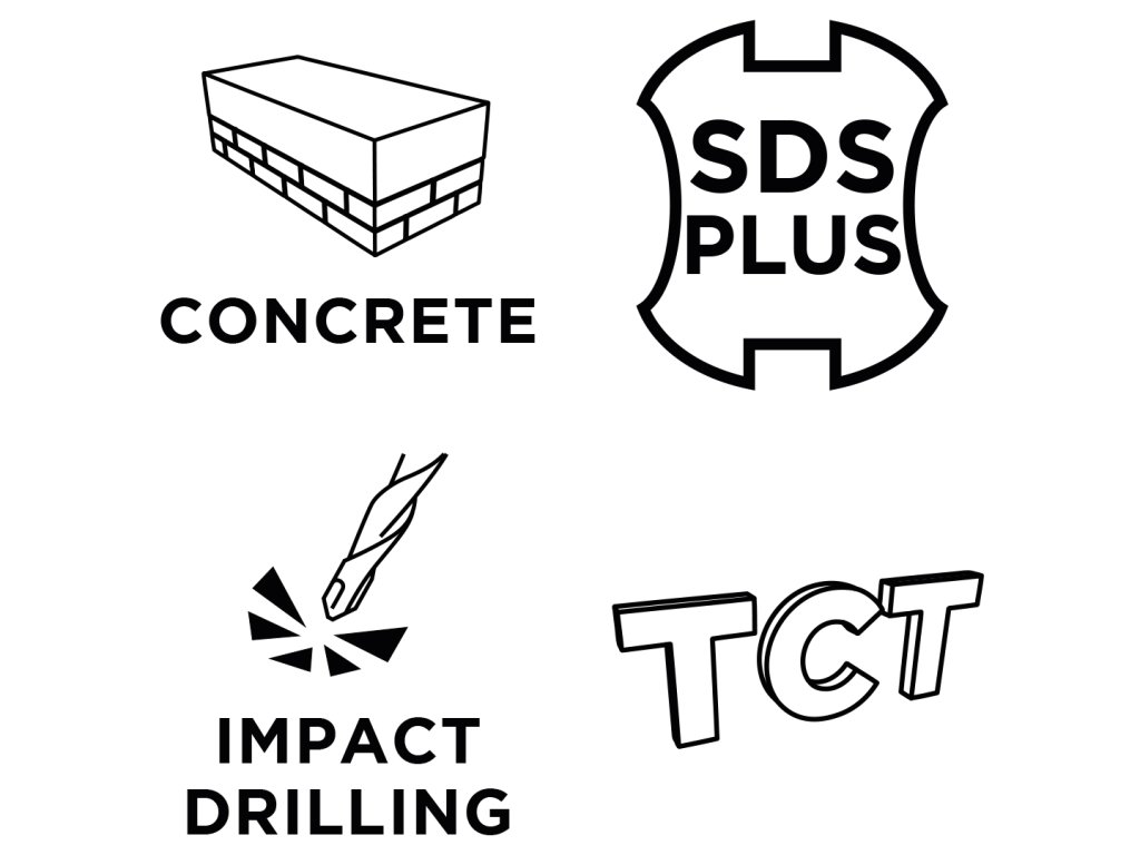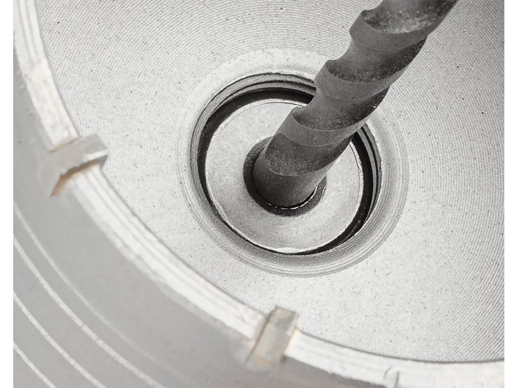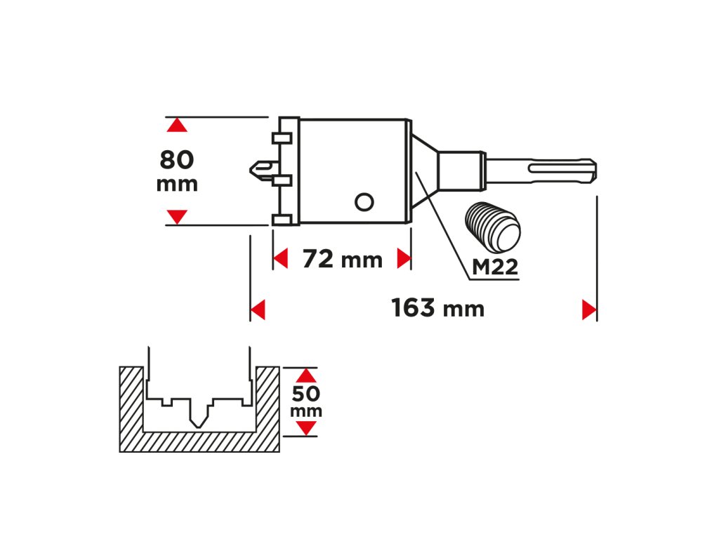 Píla na diery 80 mm s adaptérom SDS+ a pilotným vrtákom, priemer píly 80 mm, výška píly 72 mm, hĺbka vŕtania 50 mm, počet dierok 10, šírka dierok 2,2 mm, vnútorný priemer 74 mm, parametre vrtáka fi 8 x 110 mm, celková dĺžka celej sady je 163 mm.