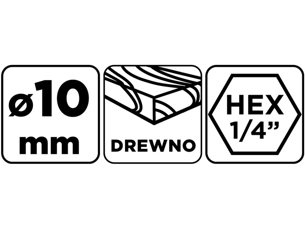 Vrták do dreva, stopka 1/4 HEX, priemer 10 mm, celková dĺžka: 120 mm, pracovná dĺžka: 84 mm, max. otáčky 1500 ot/min, použitie: drevo, preglejka.