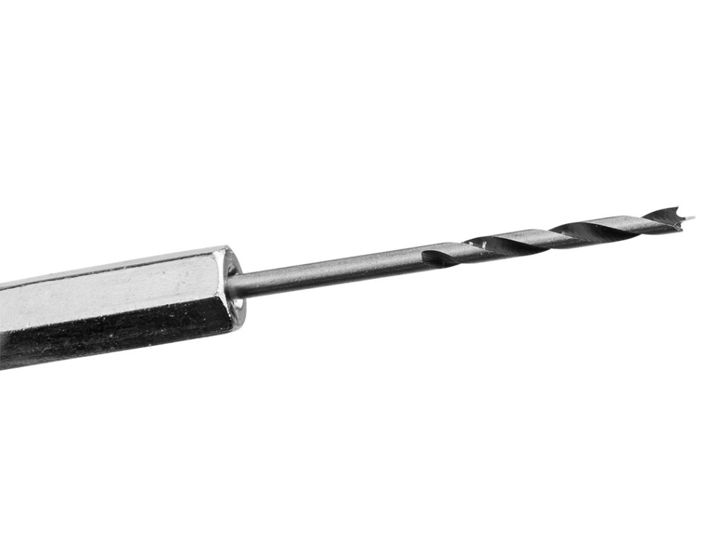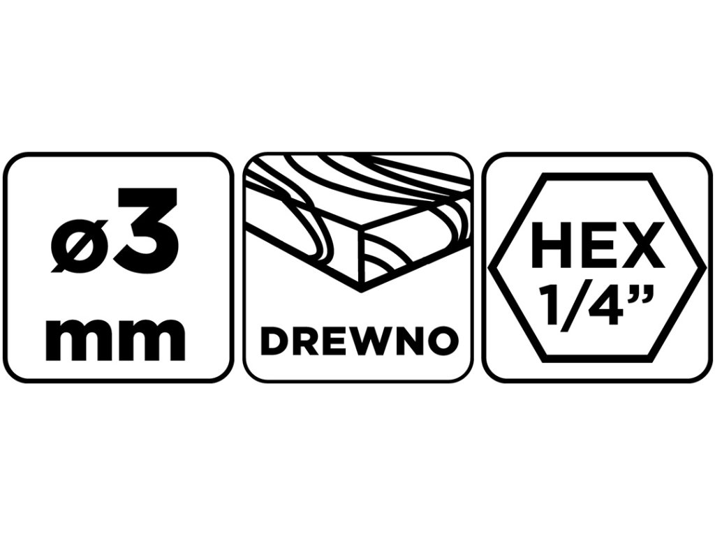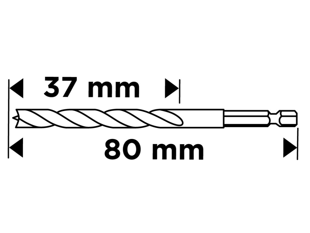 Vrták do dreva, stopka 1/4 HEX, priemer 3 mm, celková dĺžka: 80 mm, pracovná dĺžka: 37 mm, max. otáčky 2800 ot/min, použitie: drevo, preglejka.