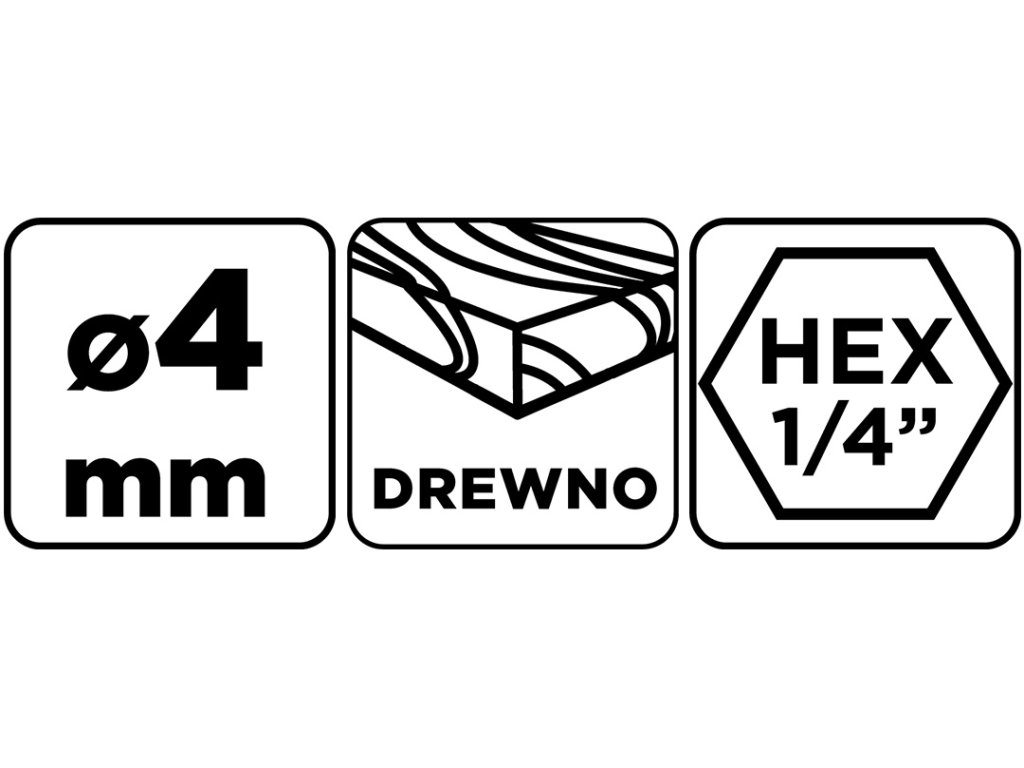Vrták do dreva, stopka 1/4 HEX, priemer 4 mm, celková dĺžka: 90 mm, pracovná dĺžka: 52 mm, max. otáčky 2800 ot/min, použitie: drevo, preglejka.