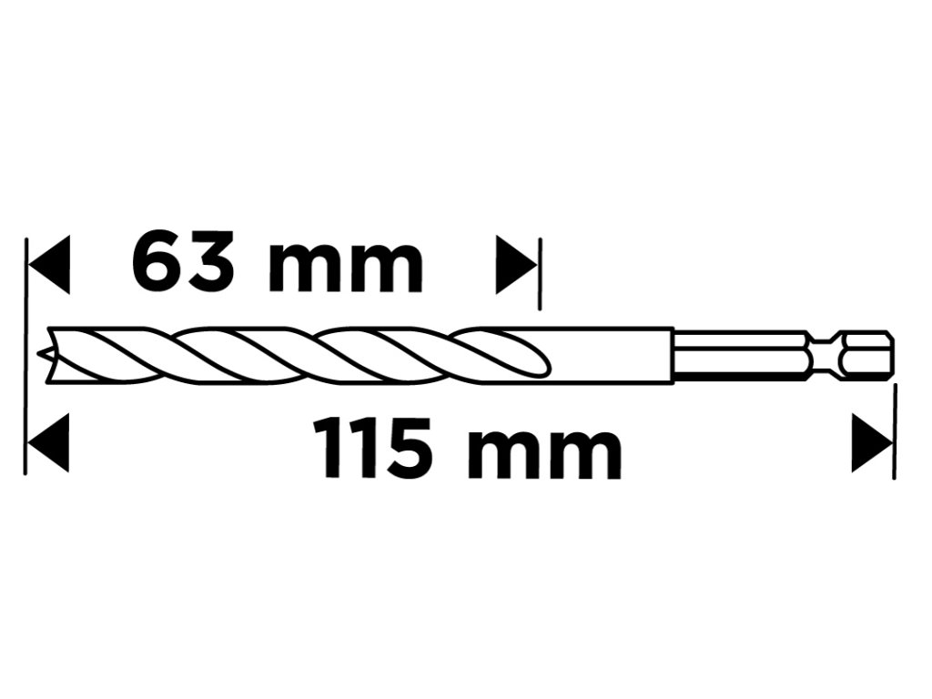 Vrták do dreva, stopka 1/4 HEX, priemer 6 mm, celková dĺžka: 115 mm, pracovná dĺžka: 63 mm, max. otáčky: 2500 ot/min, použitie: drevo, preglejka.