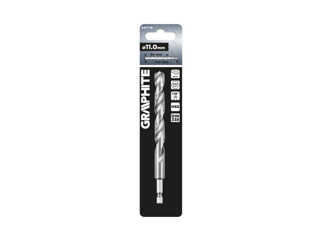 Šesťhranný vrták do kovu 11,0 mm 54T719 od spoločnosti GRAPHITE je príslušenstvo so šesťhrannou montážou, ktoré sa vyznačuje celkovou dĺžkou 142 mm a pracovnou dĺžkou 94 mm. Je v súlade s normou DIN 338 a má 118-stupňový uhol hrotu na pohodlnú prácu. Vrták značky GRAPHITE je určený na prácu s kovom. Osvedčí sa pri amatérskych aplikáciách.