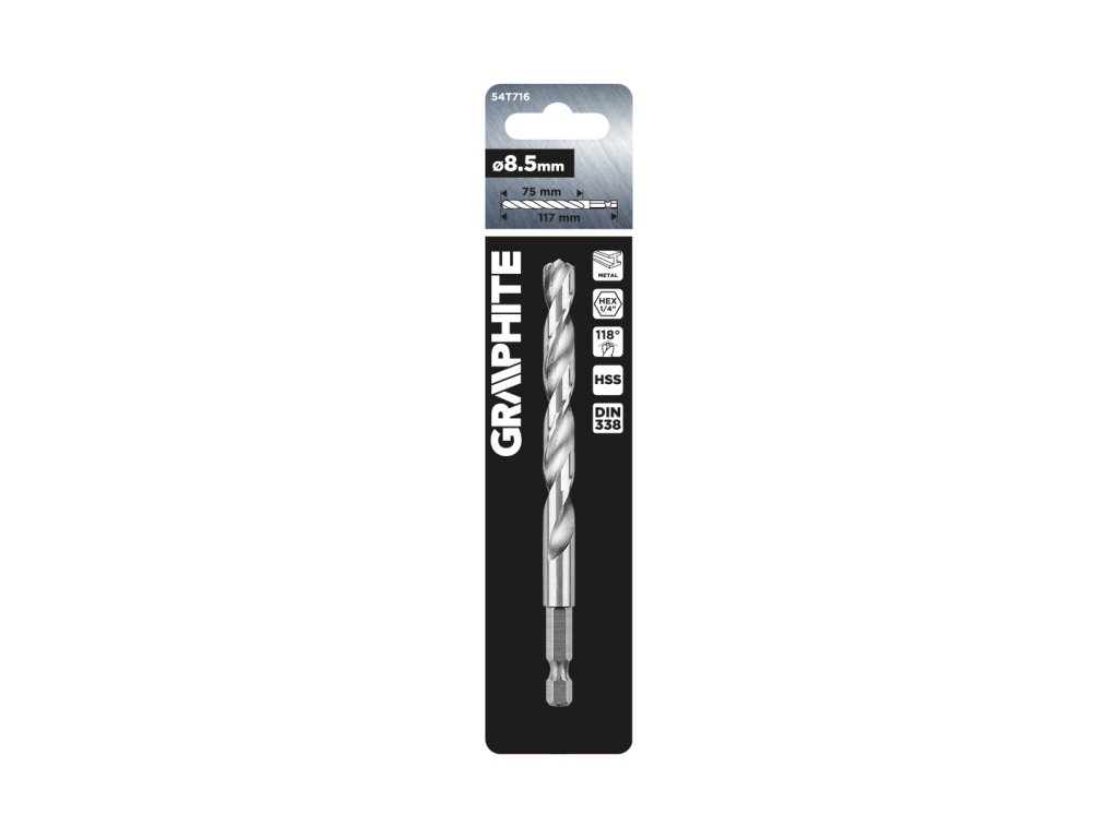 Šesťhranný vrták do kovu 8,5 mm 54T716 od spoločnosti GRAPHITE je príslušenstvo so šesťhrannou montážou, ktoré sa vyznačuje celkovou dĺžkou 117 mm a pracovnou dĺžkou 75 mm. Je v súlade s normou DIN 338 a má 118-stupňový uhol hrotu na pohodlnú prácu. Vrták značky GRAPHITE je určený na prácu s kovom. Osvedčí sa pri amatérskych aplikáciách.
