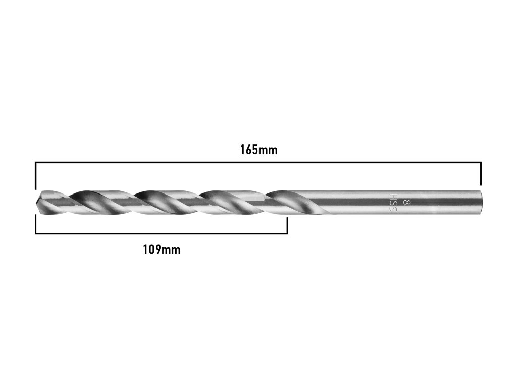Vrták do kovu z HSS, predĺžený, rozmery podľa DIN 340, valcový typ stopky, uhol hrotu 118 stupňov, priemer 8 mm, celková dĺžka 165 mm, pracovná dĺžka 109 mm.