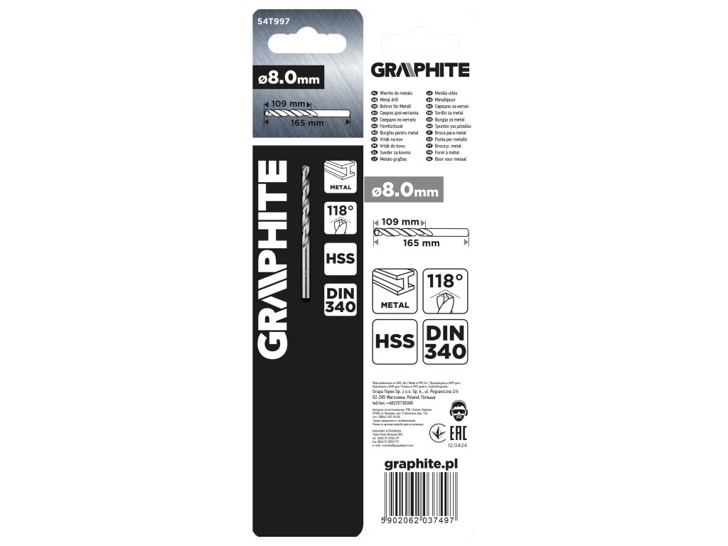 Vrták do kovu HSS, predĺžený 8,0 mm 54T997 od spoločnosti GRAPHITE je vrták určený na prácu s kovom. Má priemer 8 mm, celkovú dĺžku 165 mm a pracovnú dĺžku 109 mm. Uhol hrotu vrtáka GRAPHITE je 118 stupňov. Predĺžený nástroj je v súlade s normou DIN 338 a bude užitočný pri amatérskych aplikáciách.
