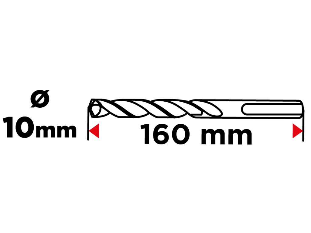 Vrták do železobetónu, stopka SDS Plus, priemer 10 mm, celková dĺžka 160 mm, vidlica QUATRO (štyri krížové vidlice), dvojitá špirála, pracovná dĺžka vrtáka 90 mm.