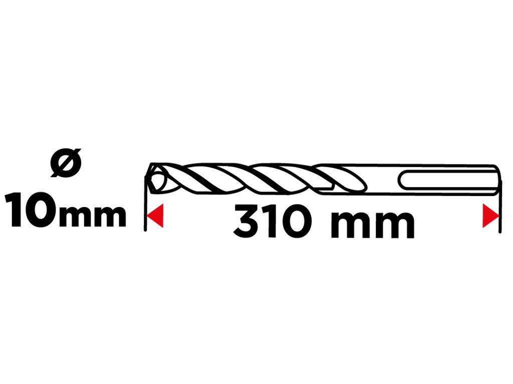 Vrták do železobetónu, stopka SDS Plus, priemer 10 mm, celková dĺžka 310 mm, vidlica QUATRO (štyri krížové vidlice), dvojitá špirála, pracovná dĺžka vrtáka 240 mm.